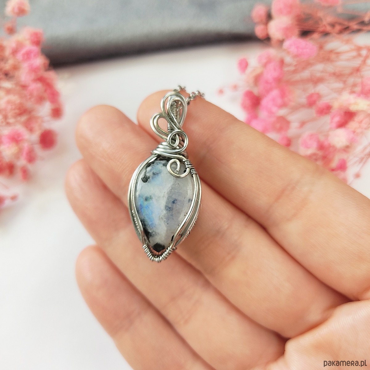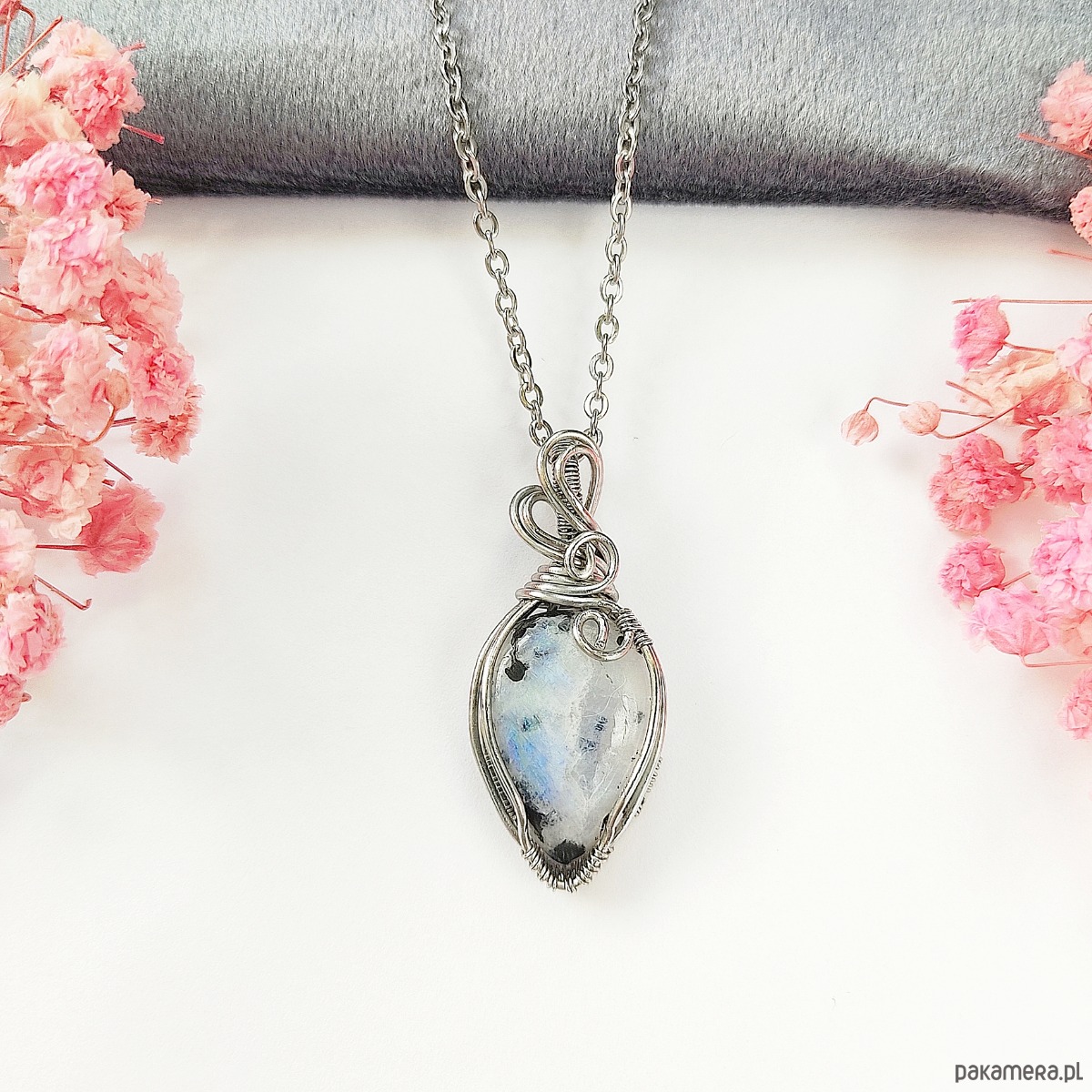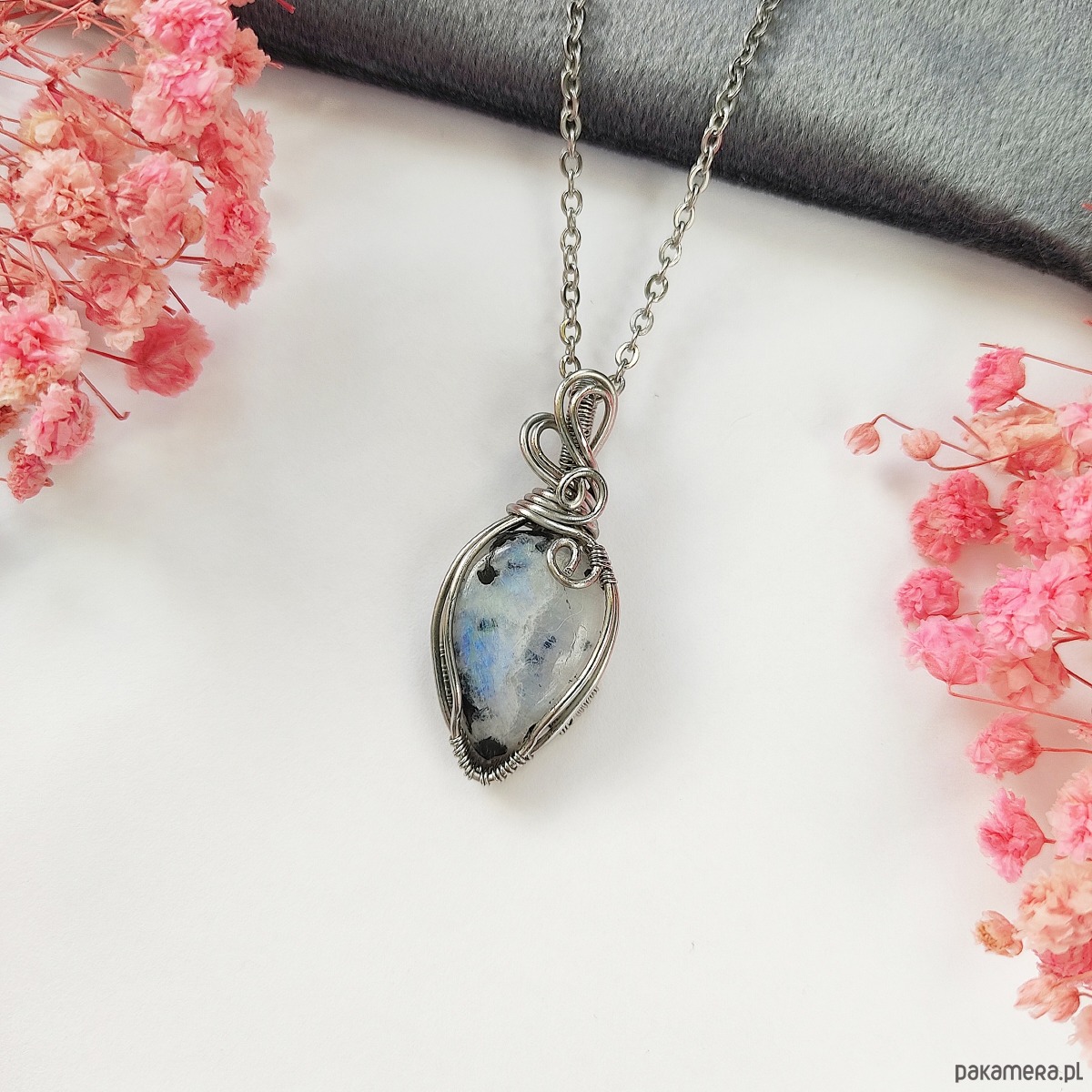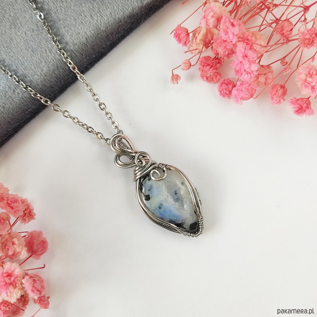 Naszyjnik Kamień Księżycowy stal chirurgiczna wisiorek handmade wirewrapping