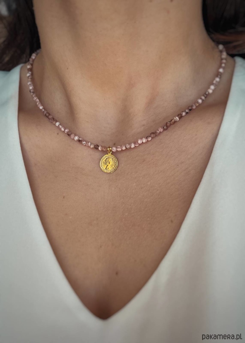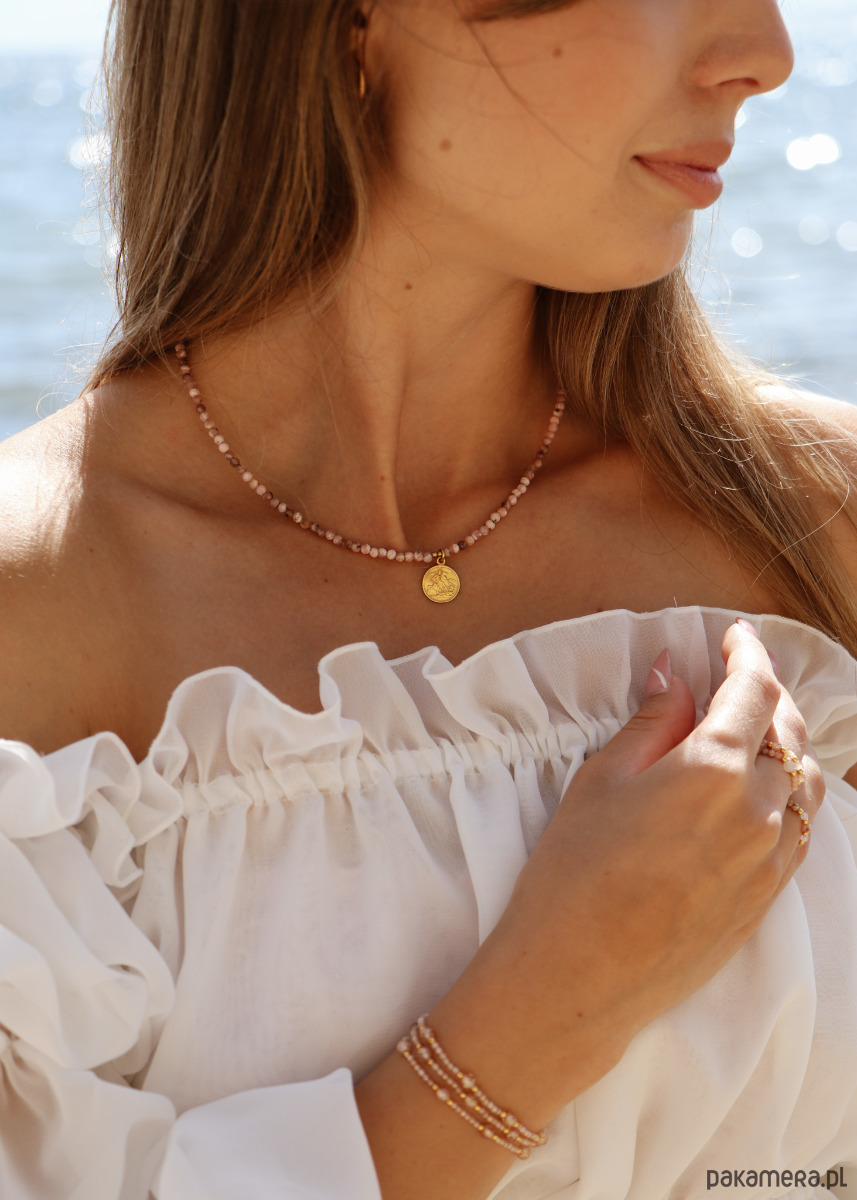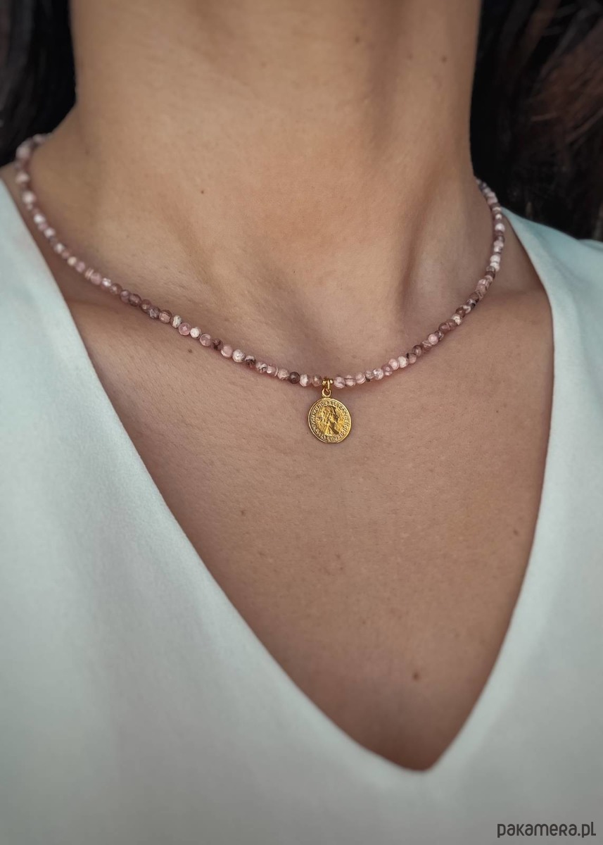 Naszyjnik stworzony z kamieni szlachetnych, kamieni naturalnych Rodochrozytów. Jest on w przepięknym, jasnoróżowym kolorze, dzięki czemu będzie idealnie pasował do wielu różnych stylizacji oraz okazji. To połączenie kamieni naturalnych ze srebrem pozłacanym próby 925, co gwarantuje najwyższą jakość produktu oraz możliwość długotrwałego użytkowania. Naszyjnik posiada dodatkowo przedłużkę o długości około 3 centymetrów, dzięki czemu można go dopasować idealnie do potrzeb.