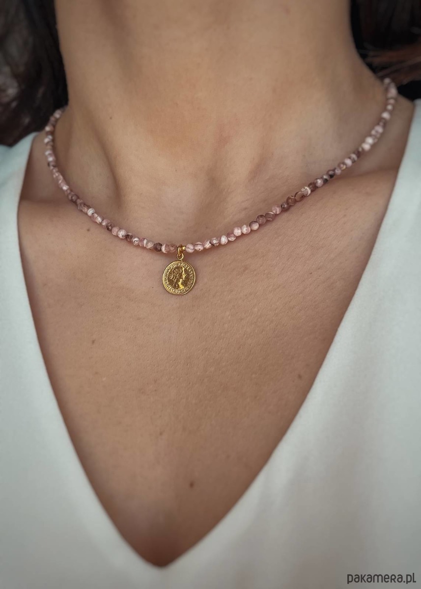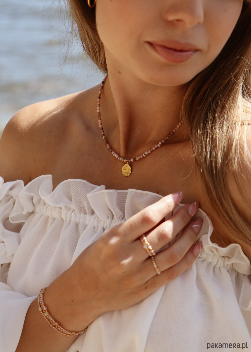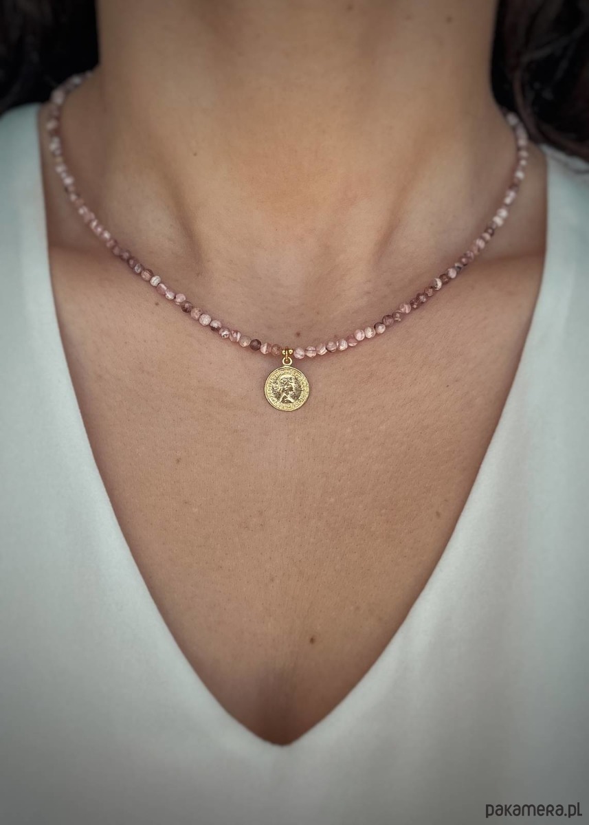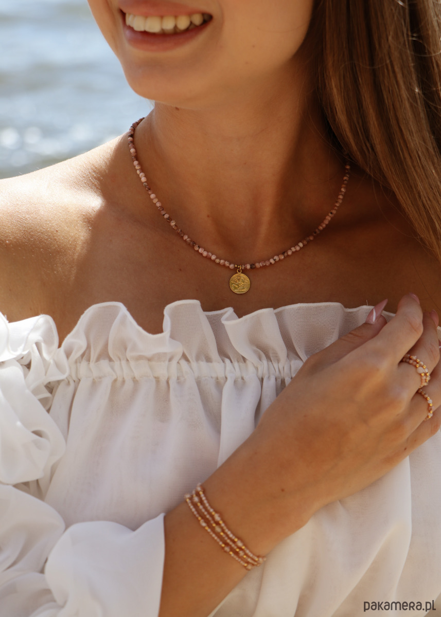 Naszyjnik stworzony z kamieni szlachetnych, kamieni naturalnych Rodochrozytów. Jest on w przepięknym, jasnoróżowym kolorze, dzięki czemu będzie idealnie pasował do wielu różnych stylizacji oraz okazji. To połączenie kamieni naturalnych ze srebrem pozłacanym próby 925, co gwarantuje najwyższą jakość produktu oraz możliwość długotrwałego użytkowania. Naszyjnik posiada dodatkowo przedłużkę o długości około 3 centymetrów, dzięki czemu można go dopasować idealnie do potrzeb.