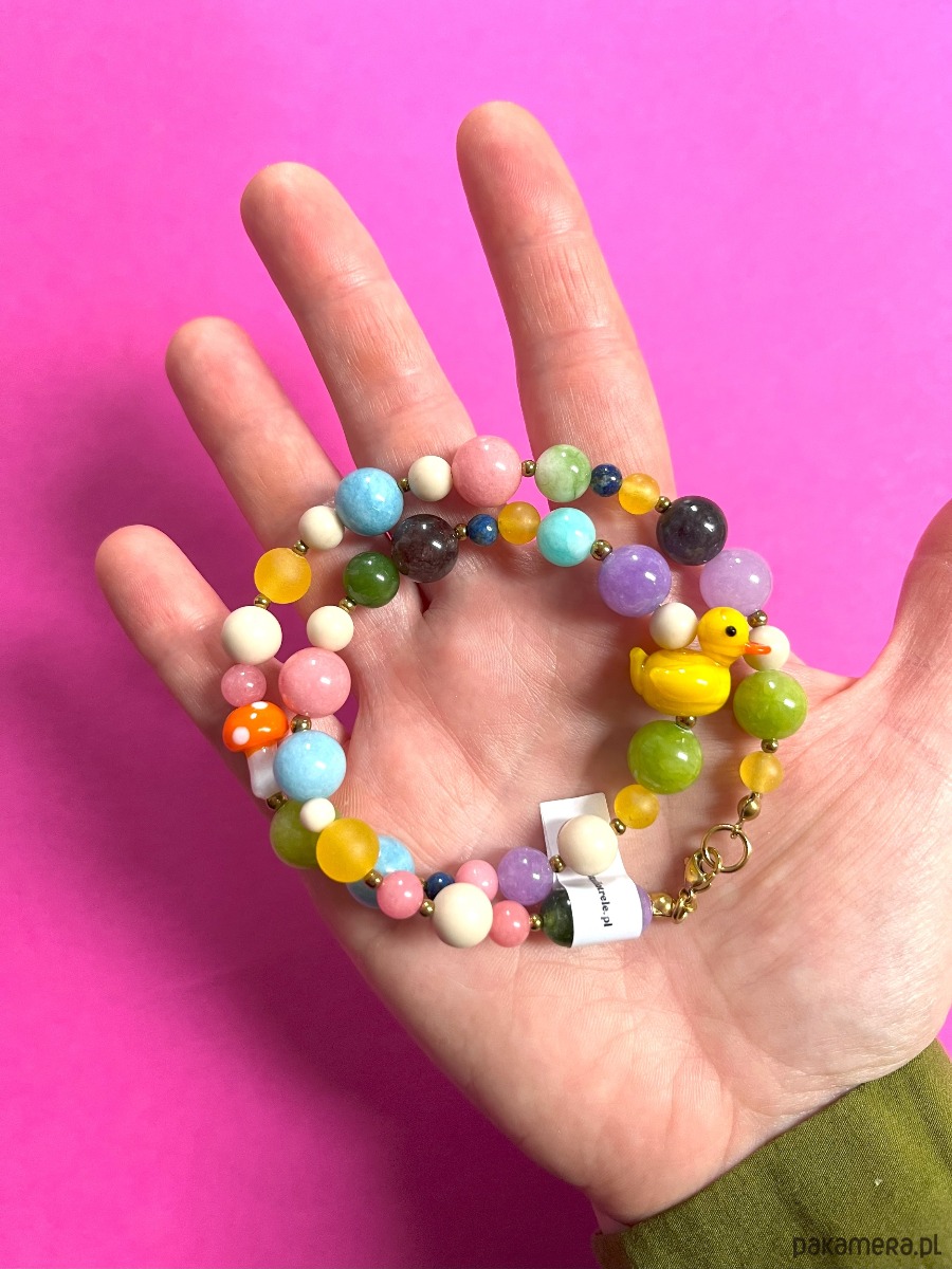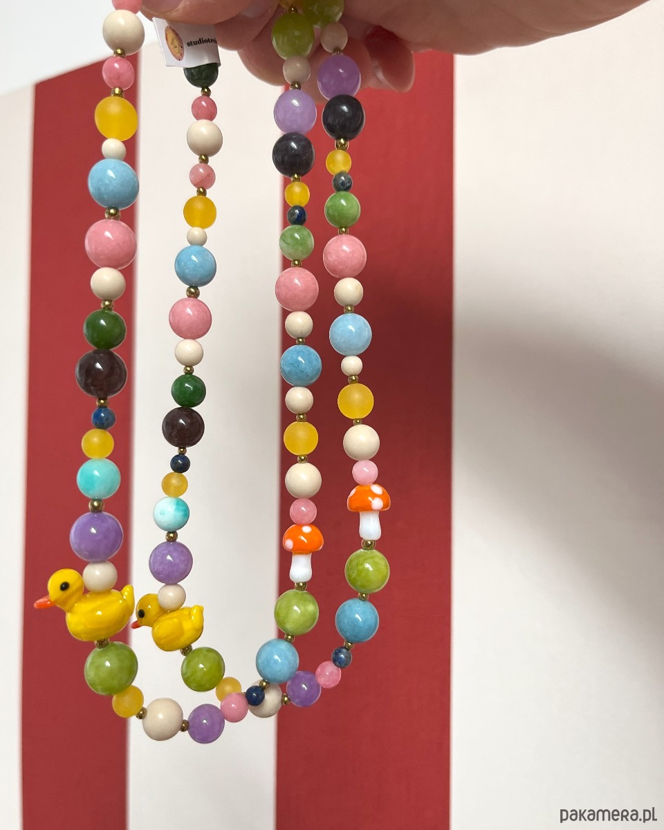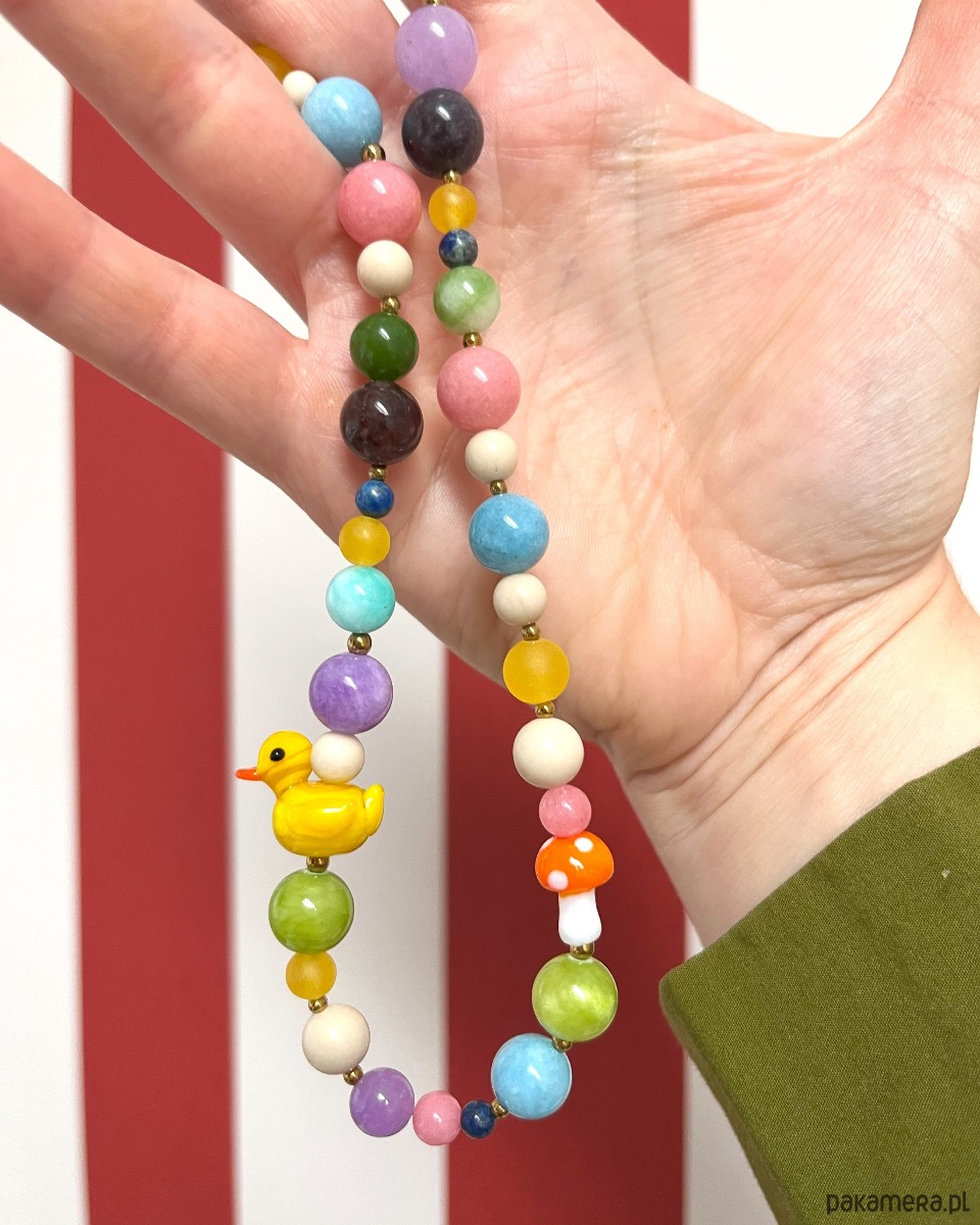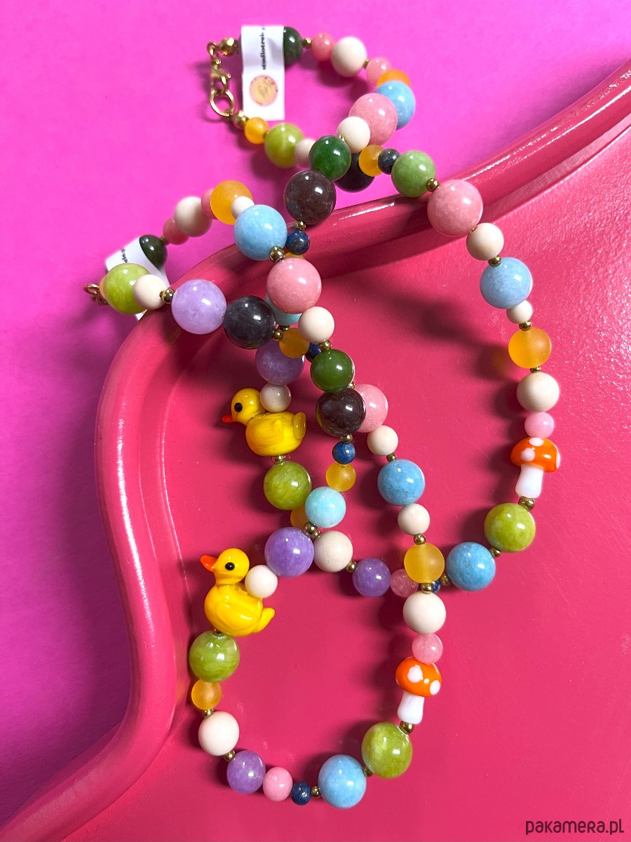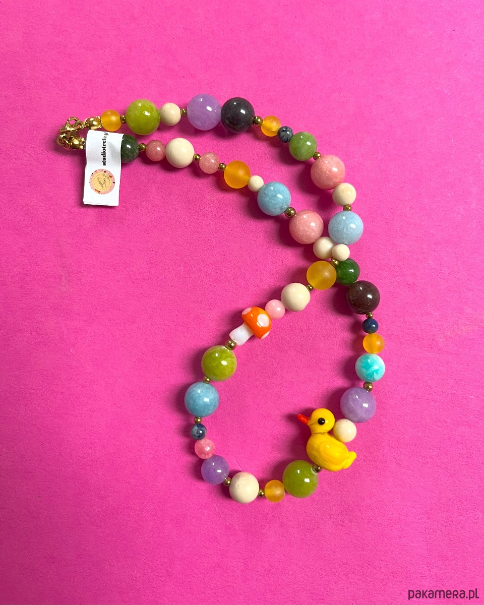 Kolorowy naszyjnik z kamieni z twistem w postaci szklanej kaczuszki i grzybka