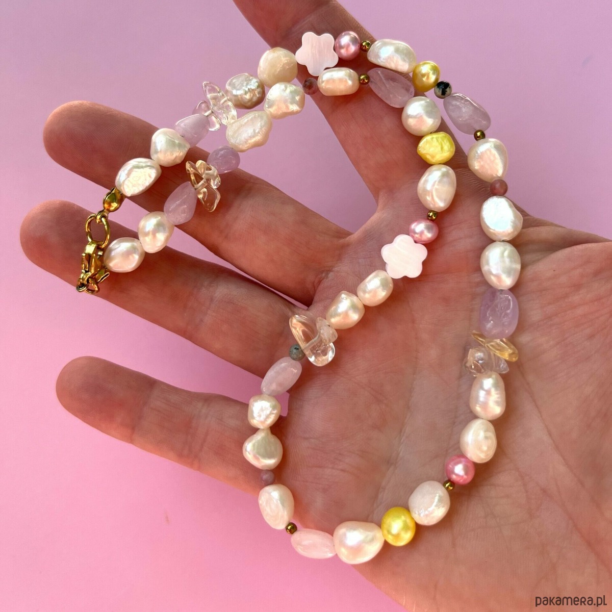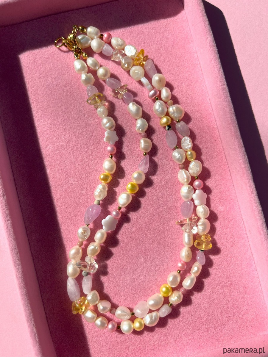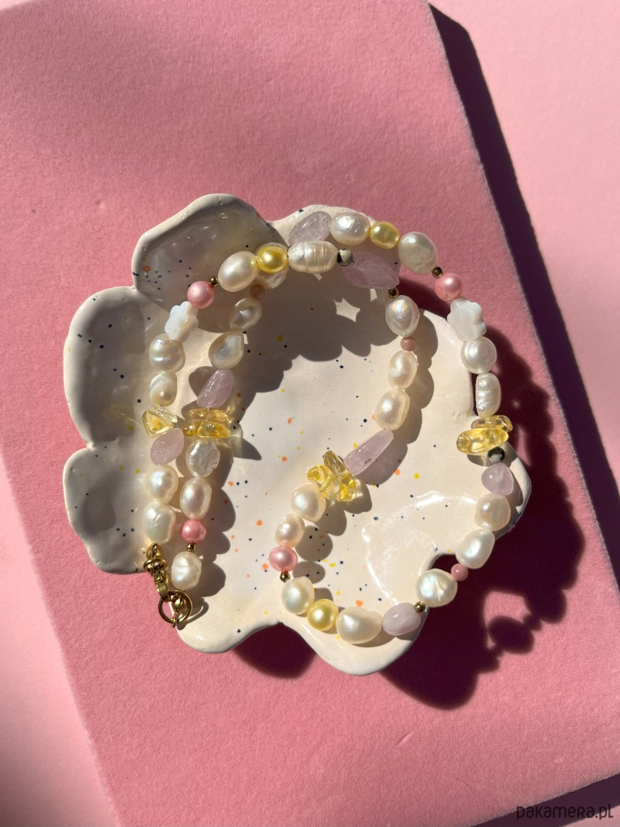 Skład: perła słodkowodna, muszla słodkowodna, kunzyt, cytryn, jaspis dalmatyński, rodonit, hematyt