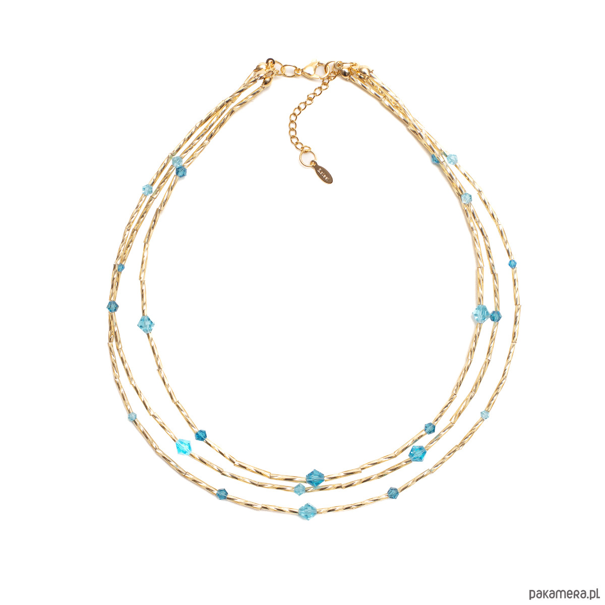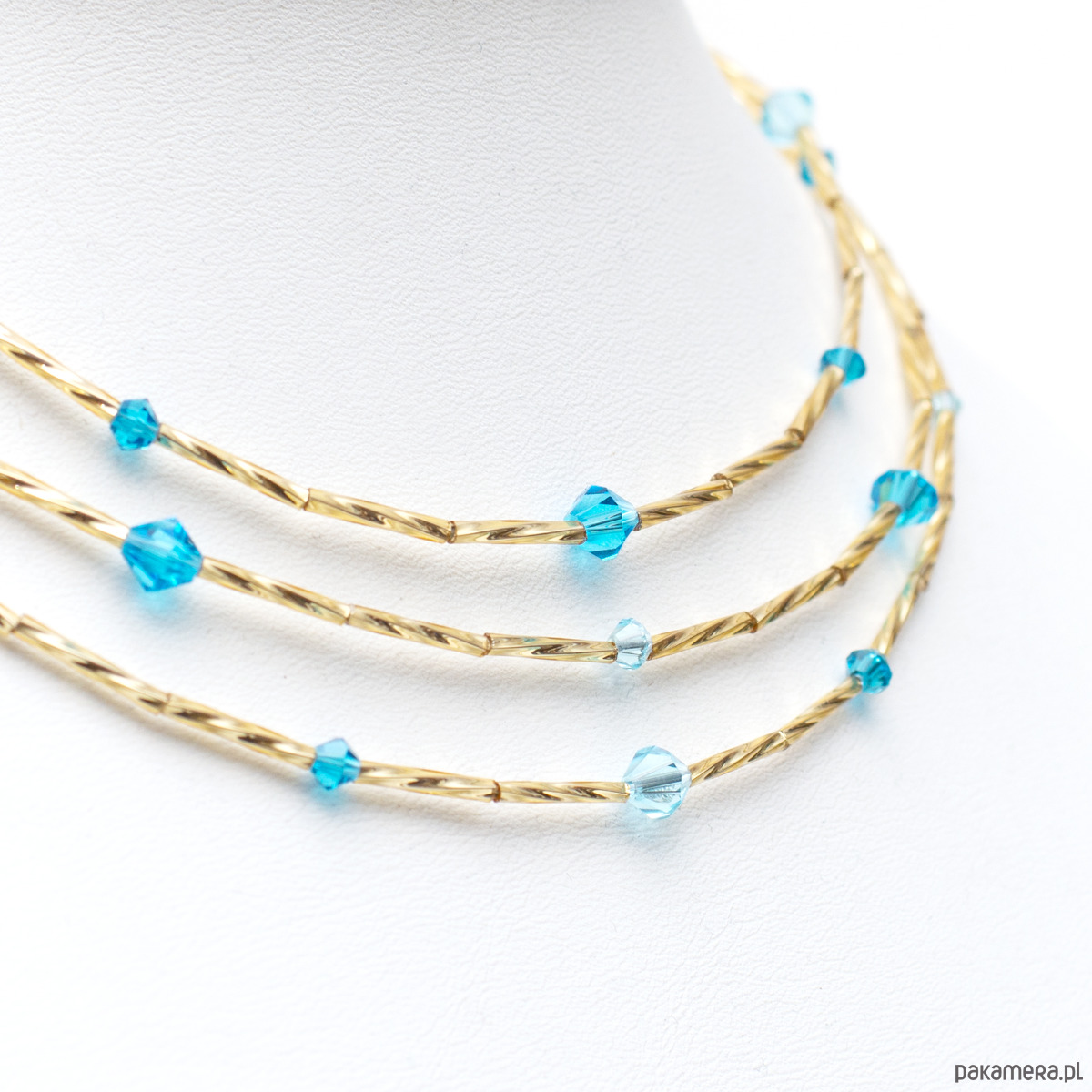 Azure to ucieleśnienie beztroski i wakacyjnych marzeń. Jej złociste rzędy przeplatane są migoczącymi, turkusowymi kryształkami, tworząc efekt musującej fali. Noś ją, by poczuć się spokojnie, radośnie i optymistycznie. To Twój amulet, który przyciąga pomyślność i podróże.