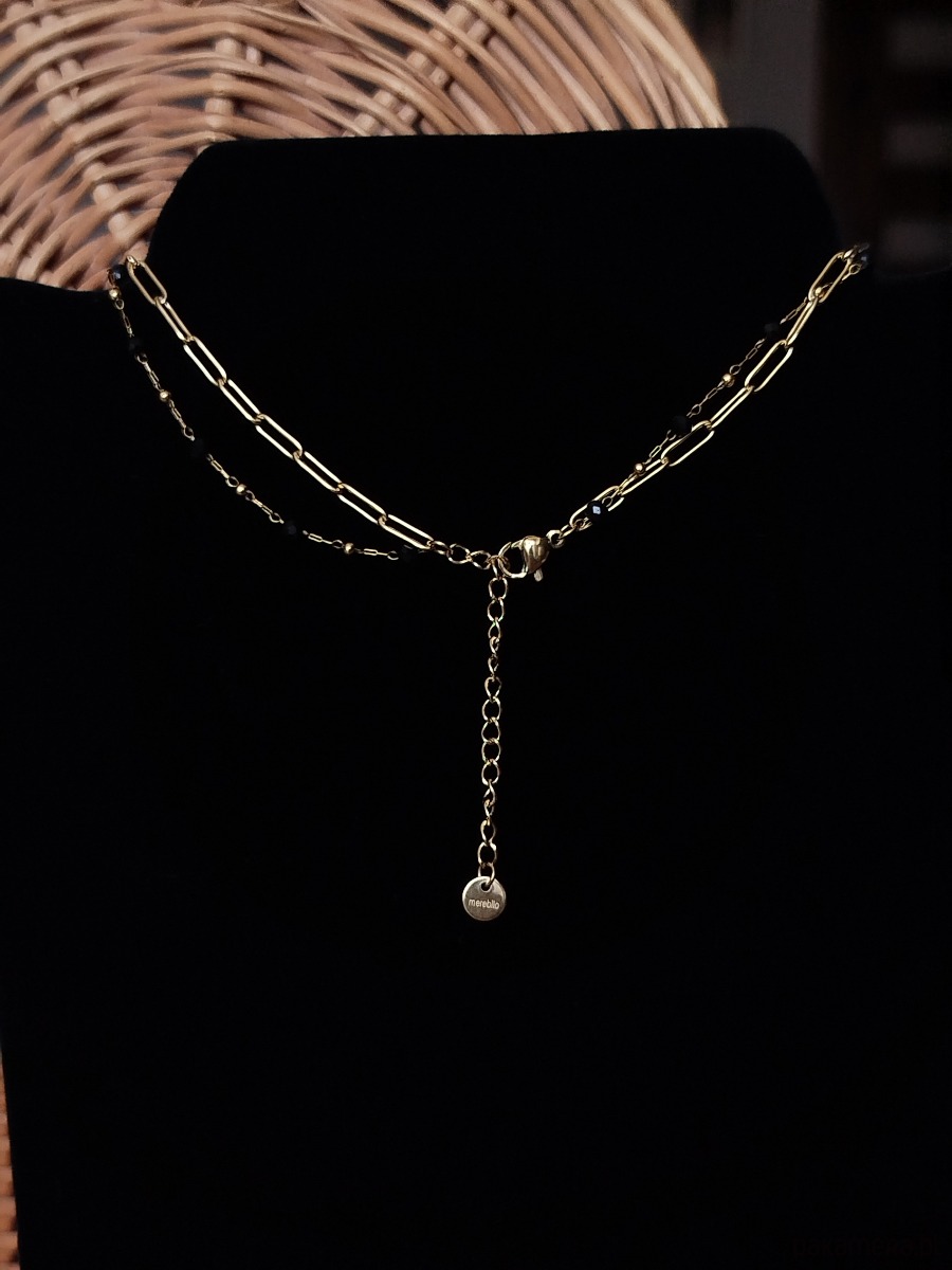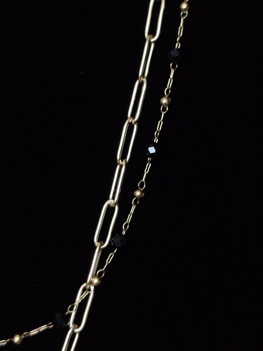 Krótszy o długości 38.5cm składa się ze szklanych kuleczek w kolorze czarnym oraz mniejszych złotych kuleczek.
