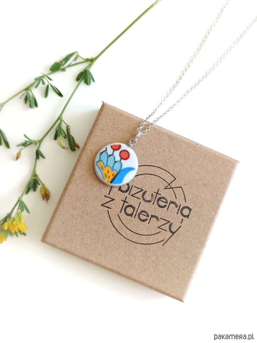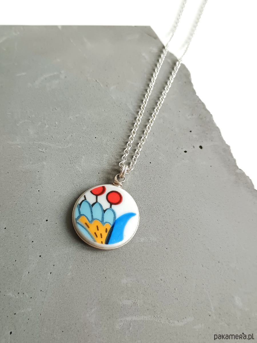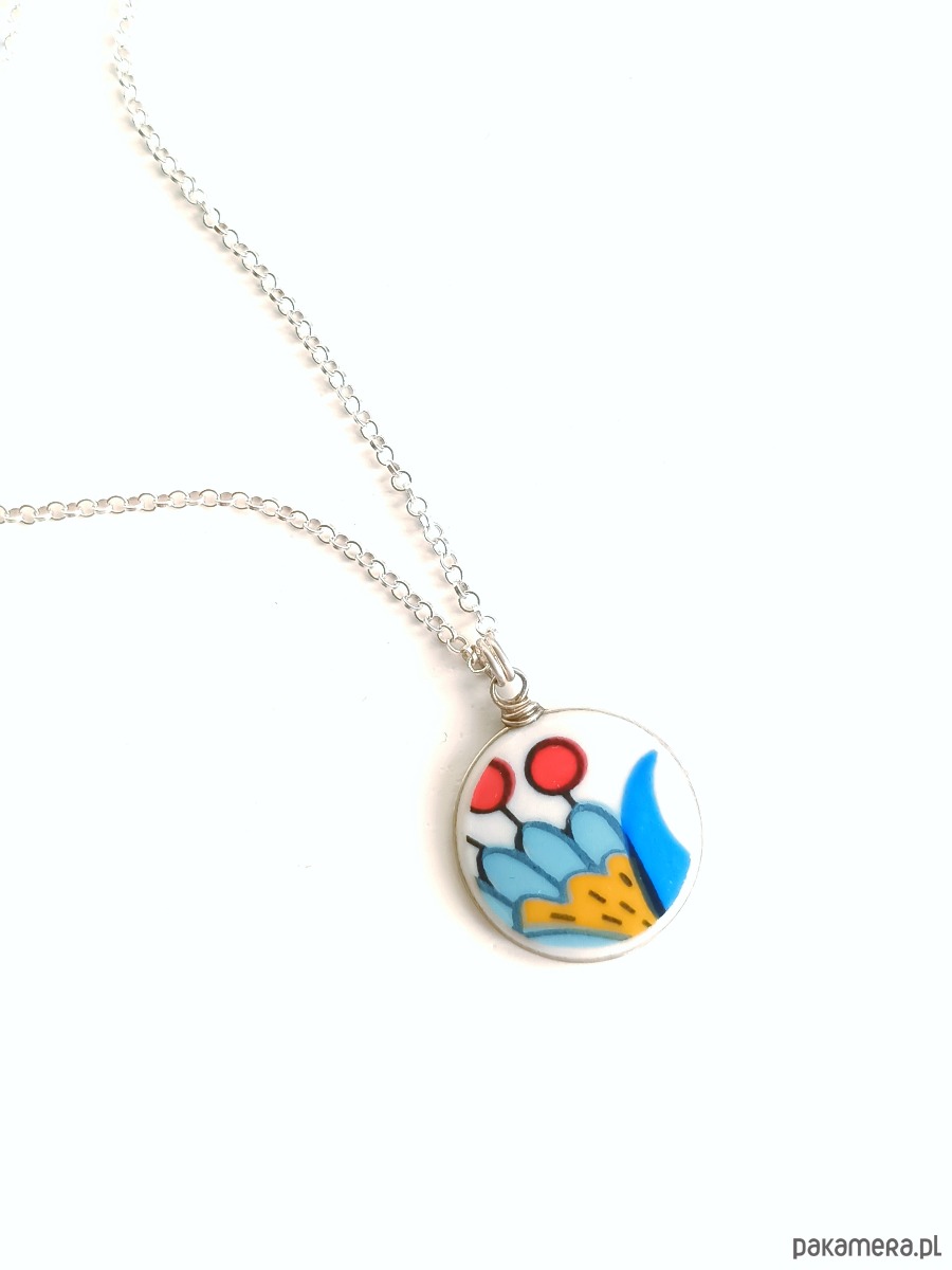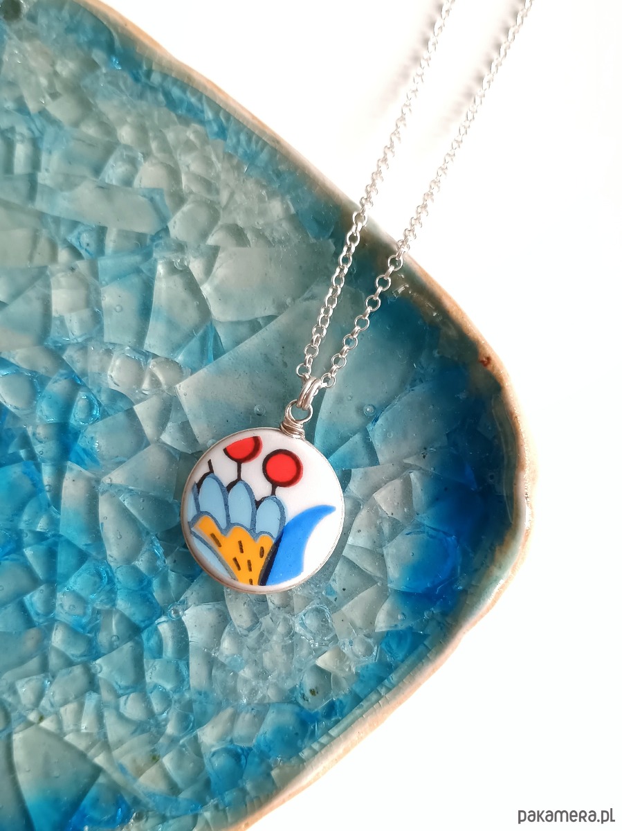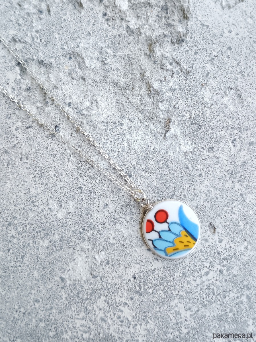Oto naszyjnik, który wykonałam z fragmentu stłuczonego talerza wyprodukowanego w fabryce Lubiana z tradycyjnym wzorem kaszubskim. Kawałek stłuczki oszlifowałam nadając okrągły ksztalt, oprawiłam w drucik i zamocowałam na srebrnym łańcuszku (srebro 925). Ceramikę zeszlifowałam również z grubości - jest cieńsza niż pierwotnie, dzięki czemu wisiorek nie jest ciężki. Brzegi i tył pokryłam lakierem, co sprawia, że nie brudzą się i nie chłoną wilgoci. Średnica zawieszki ceramicznej: 17 mm. Długość łańcuszka w całości: 45 cm. Unikat - każdy z moich wyrobów występuje w jednym egzemplarzu. Upcykling - nie reprodukuję wykorzystywanych wzorów, niczego nie domalowuję - wykorzystuję wyłącznie oryginalne naczynia i motywy, które się na nich znajdują. Tym samym, stłuczce z odzysku nadaję nowe życie.