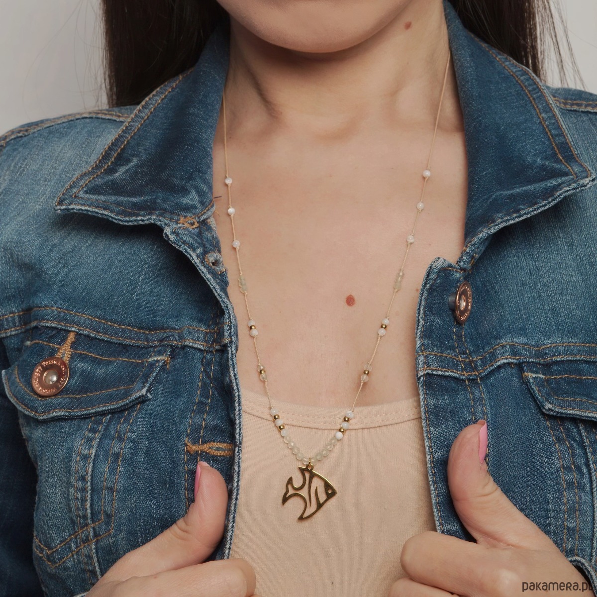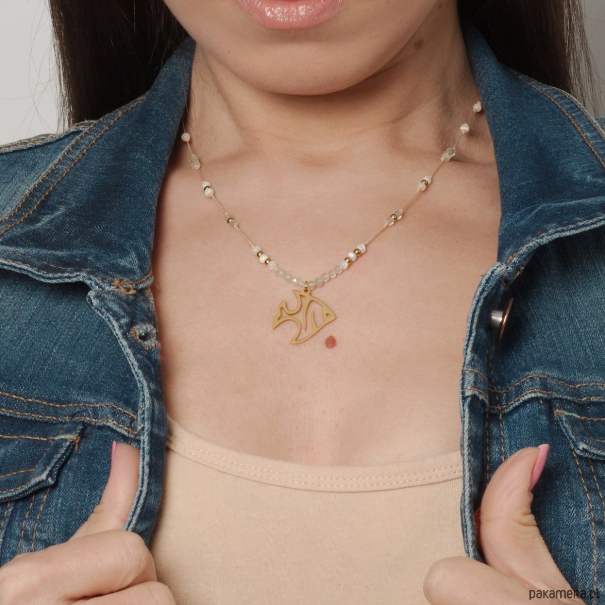 Zdobią go: kamienie szlifowanych frenitów 3mm, zestawione z subtelnymi, gładkimi koralikami z masy perłowej 3mm oraz kuleczkami z antyalergicznej stali chirurgicznej w rozmiarze 3mm. Wykończony został zawieszką ze stali chirurgicznej w kształcie ryby.