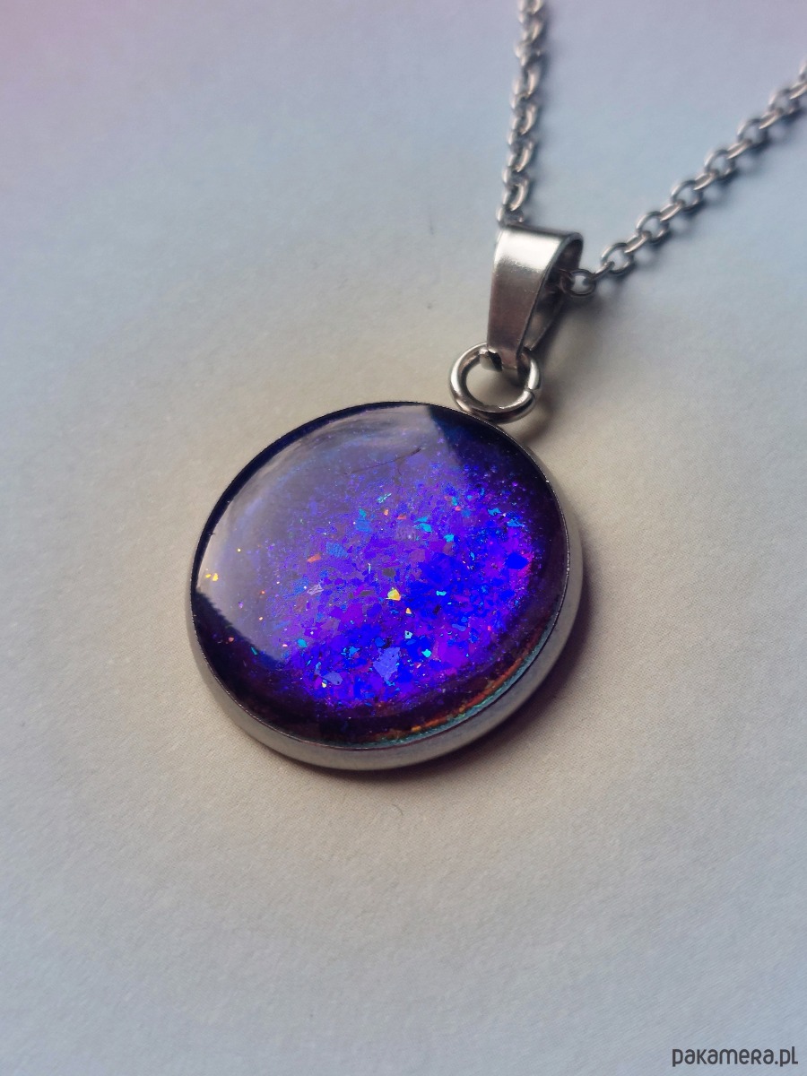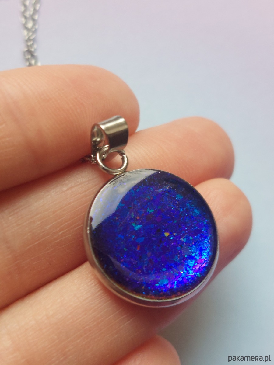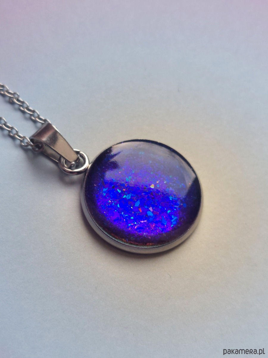 Drobinki błyszczącej niebieskiej foli zabezpieczone zostały warstwą żywicy epoksydowej. Baza wisiorka i łańcuszek wykonany ze stali chirurgicznej.