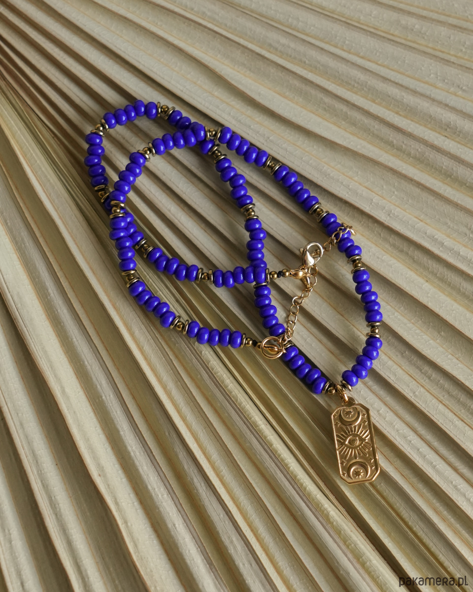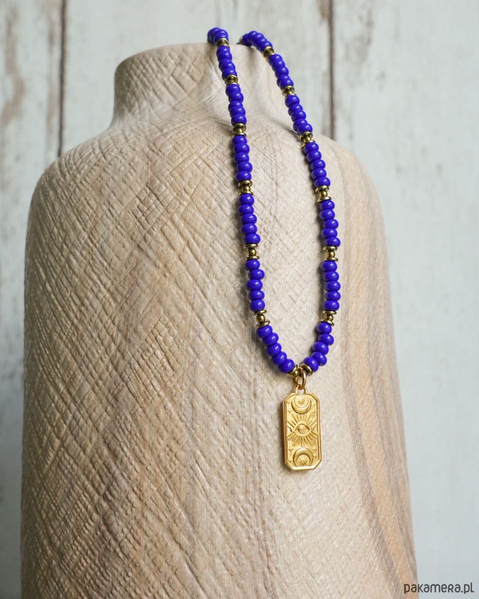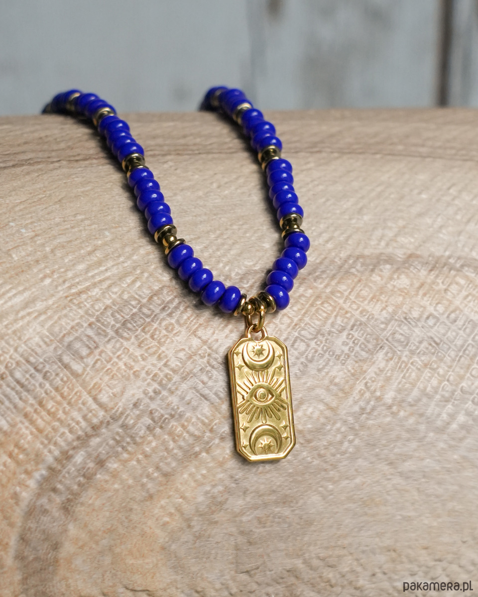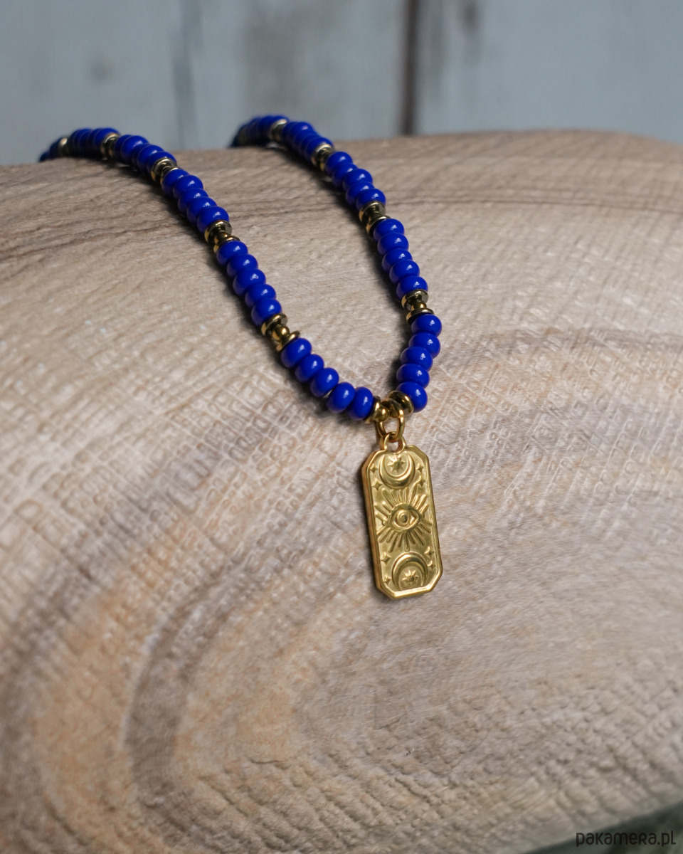 Krótki naszyjnik wykonany z kobaltowych SZKLANYCH KORALIKÓW i złotego HEMATYTU. Prostokątna, ozdobna zawieszka z okiem, lunulami i gwiazdkami, wykonana jest ze STALI SZLACHETNEJ w kolorze złotym. Zapięcie i łańcuszek to również stal szlachetna.