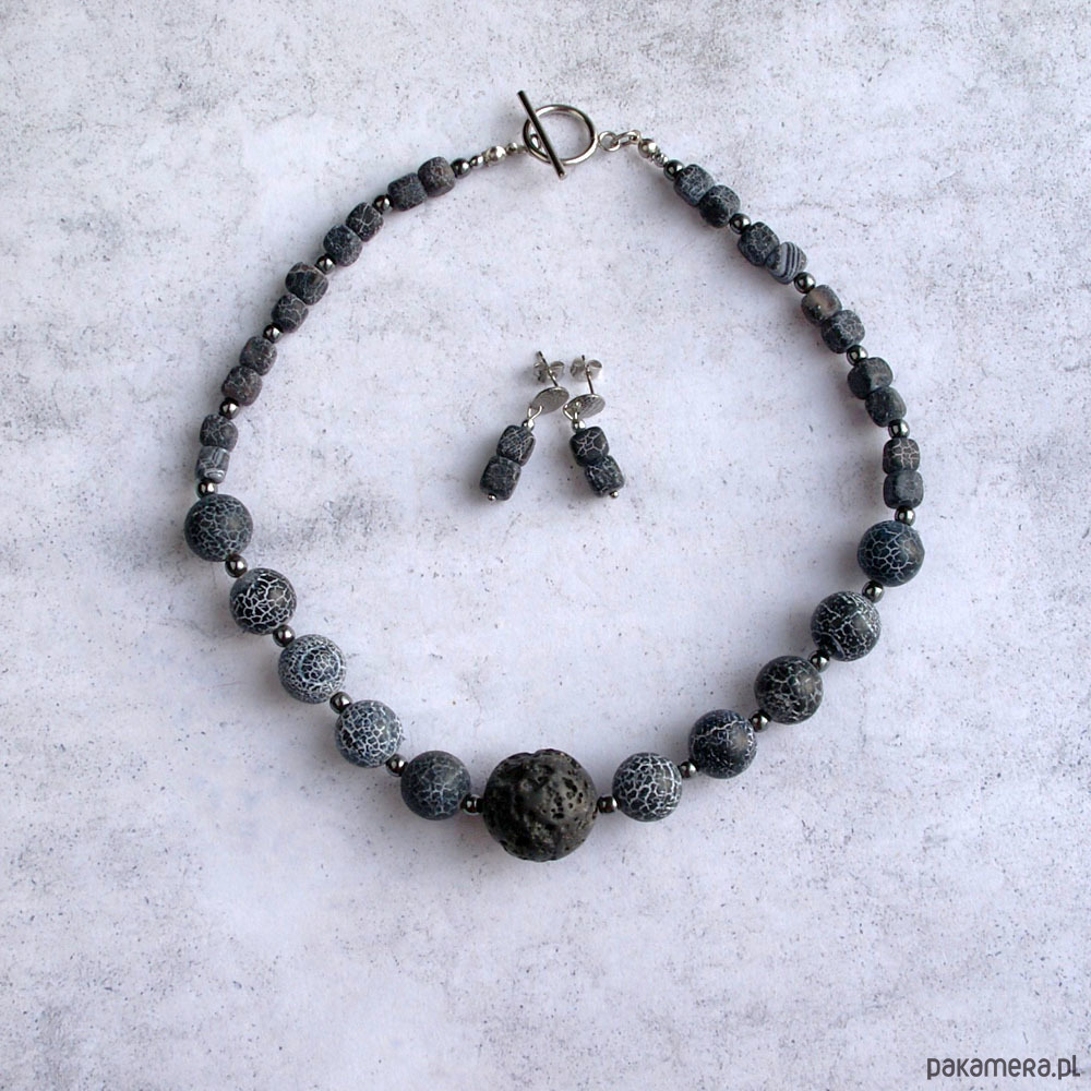 -czarny agat trawiony, matowy, z białymi spękaniami (kule 14mm, kostki 9mm)