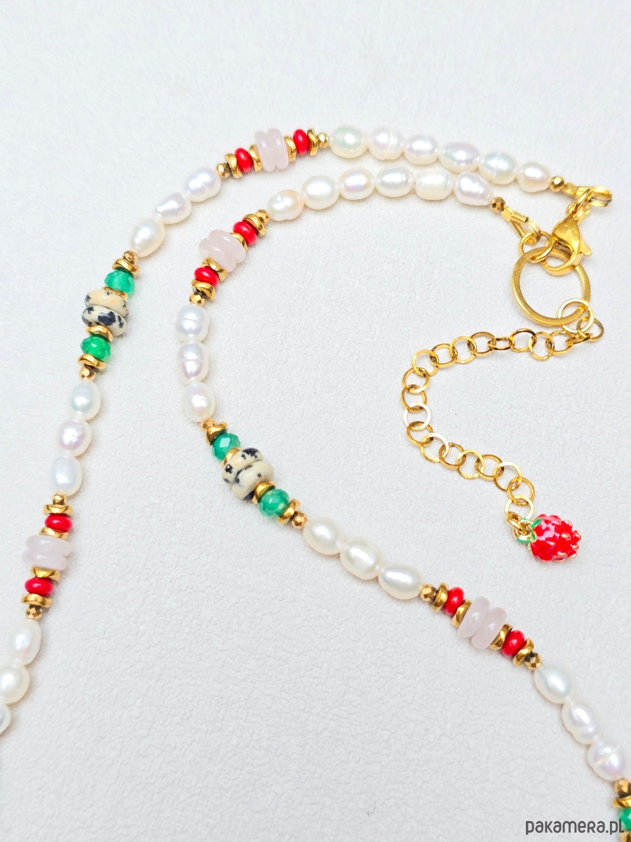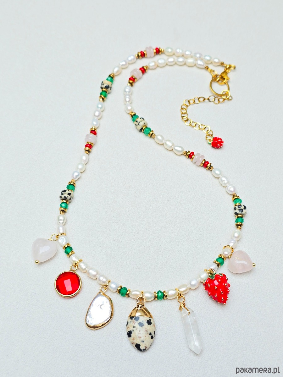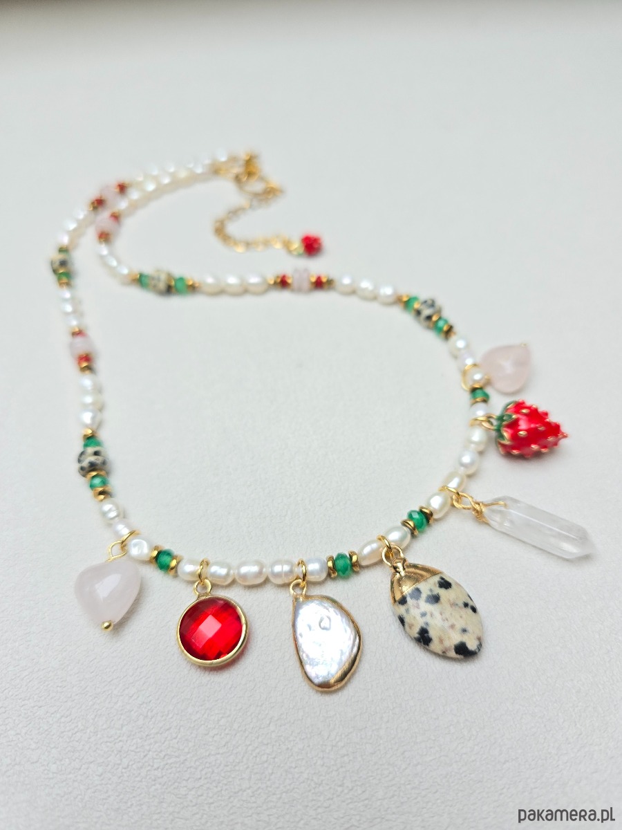 Niepowtarzalny naszyjnik z kamieni naturalnych w które wkomponowałam 7 zawieszek, tworząc unikatową, energetyczną kolię. Motyw poziomki idealnie oddaje letni klimat.