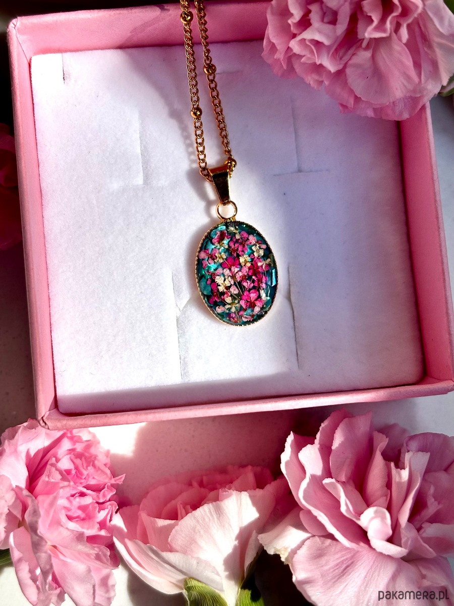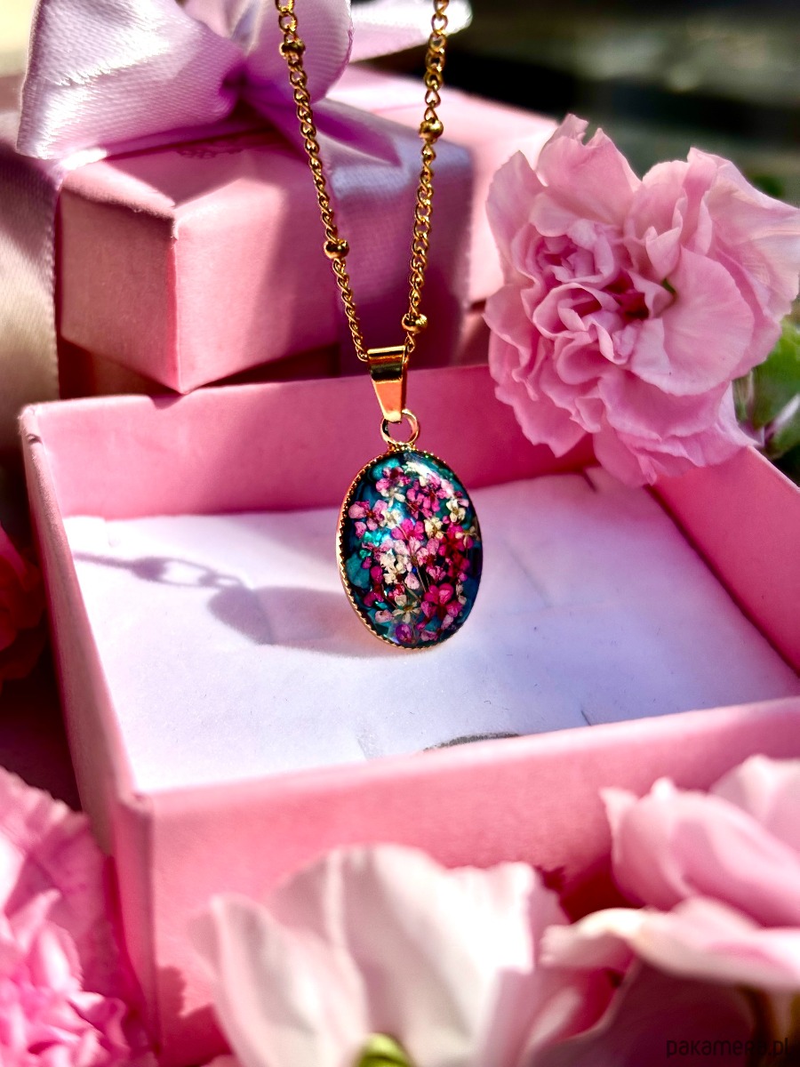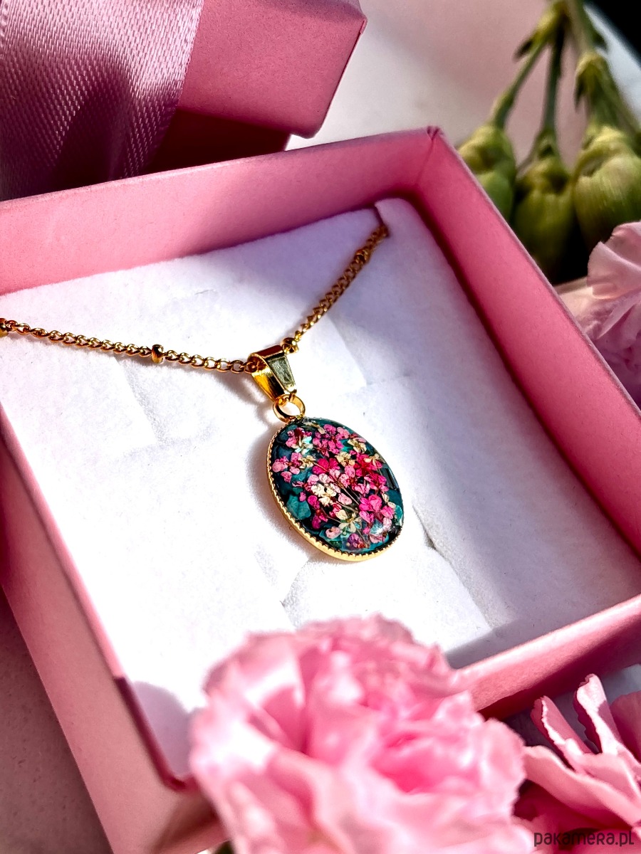 W owalnej oprawie o wymiarach 20 mm x 14 mm zostały zatopione starannie wyselekcjonowane, ręcznie suszone kwiaty dzikiej marchwi. Każdy z płatków zachował swoją unikalną formę, dzięki czemu kompozycja przypomina miniaturową, kwitnącą łąkę zatrzymaną w czasie.