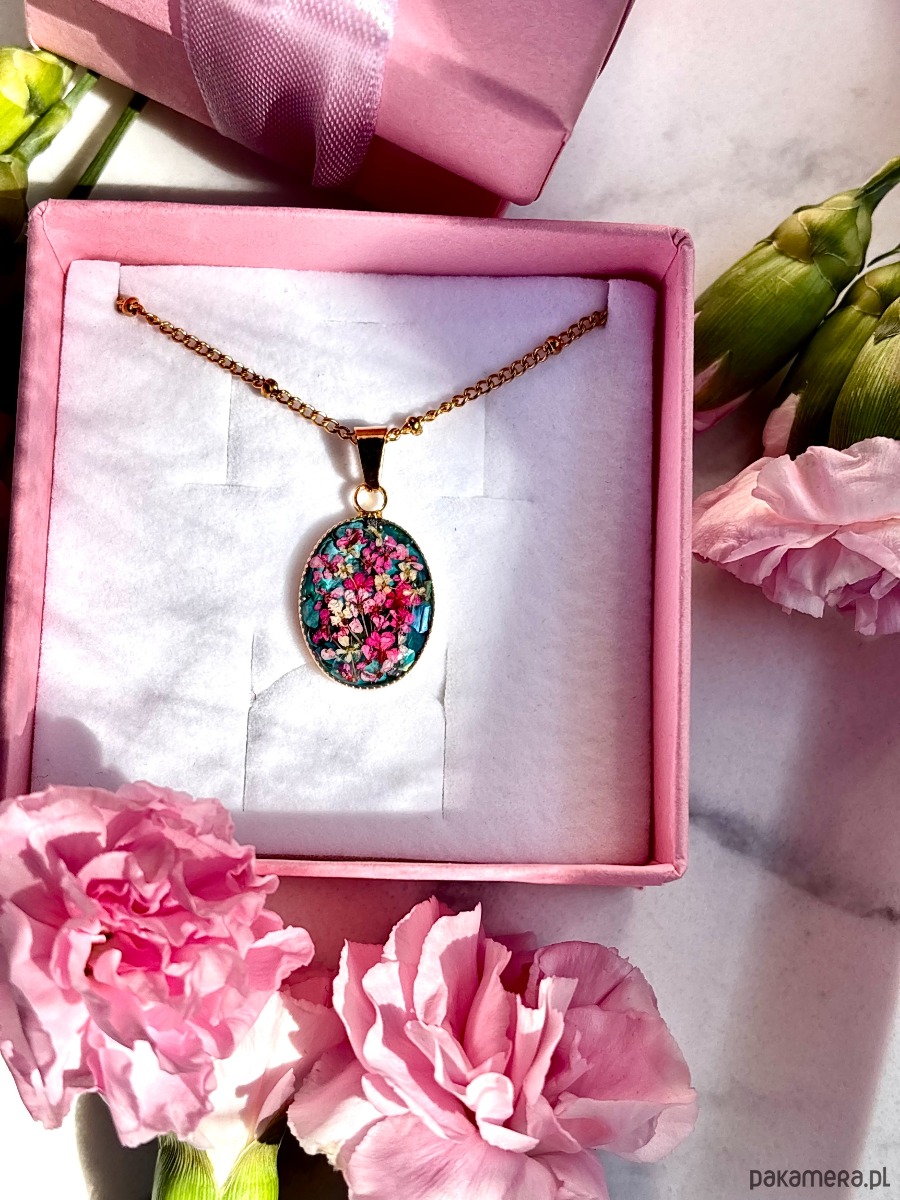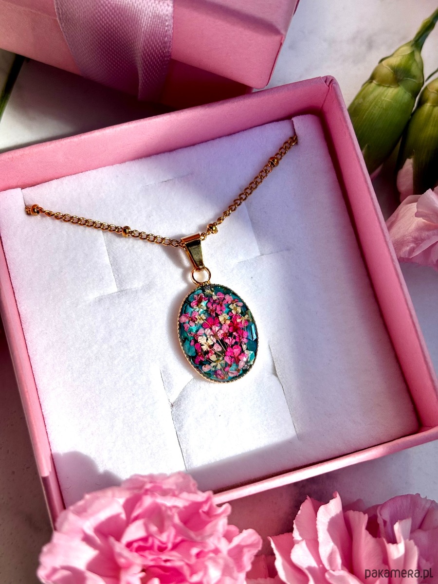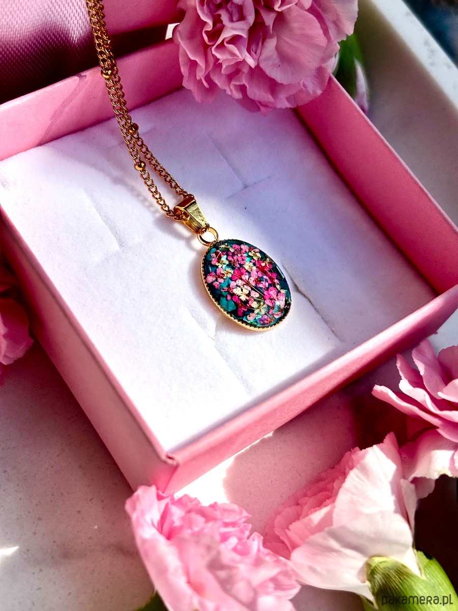 W owalnej oprawie o wymiarach 20 mm x 14 mm zostały zatopione starannie wyselekcjonowane, ręcznie suszone kwiaty dzikiej marchwi. Każdy z płatków zachował swoją unikalną formę, dzięki czemu kompozycja przypomina miniaturową, kwitnącą łąkę zatrzymaną w czasie.