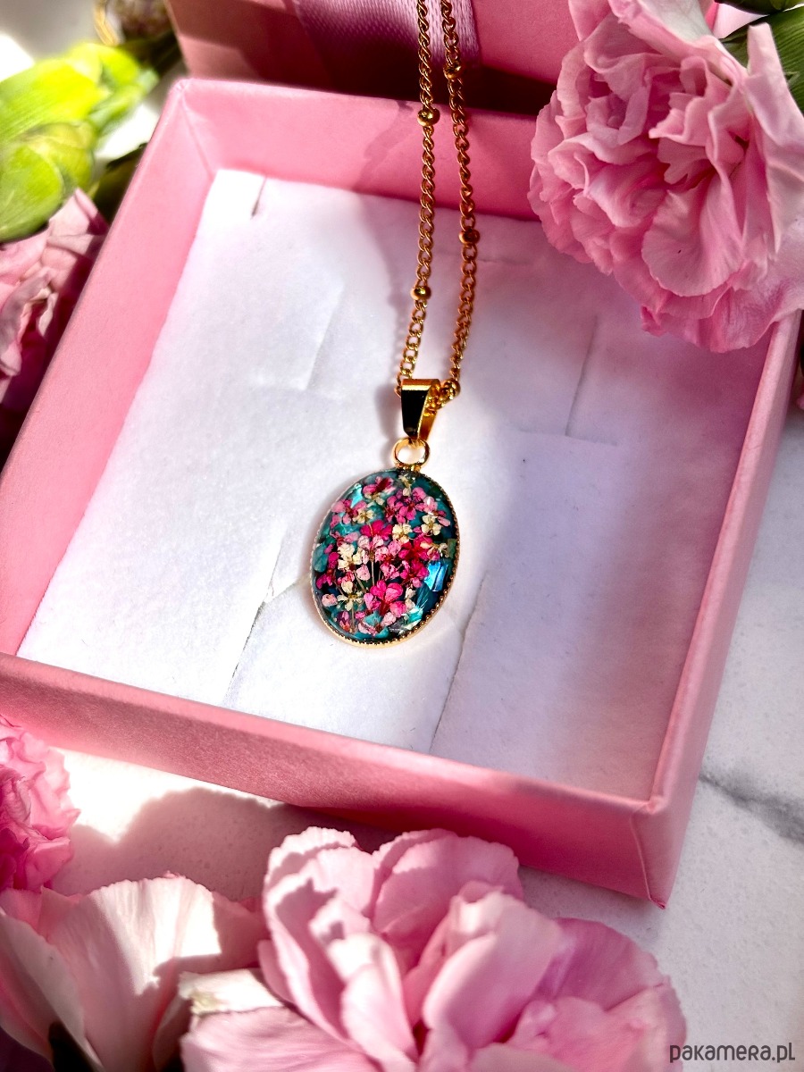Materiał: stal nierdzewna w kolorze złotym, żywica epoksydowa, suszone kwiaty, muszle.