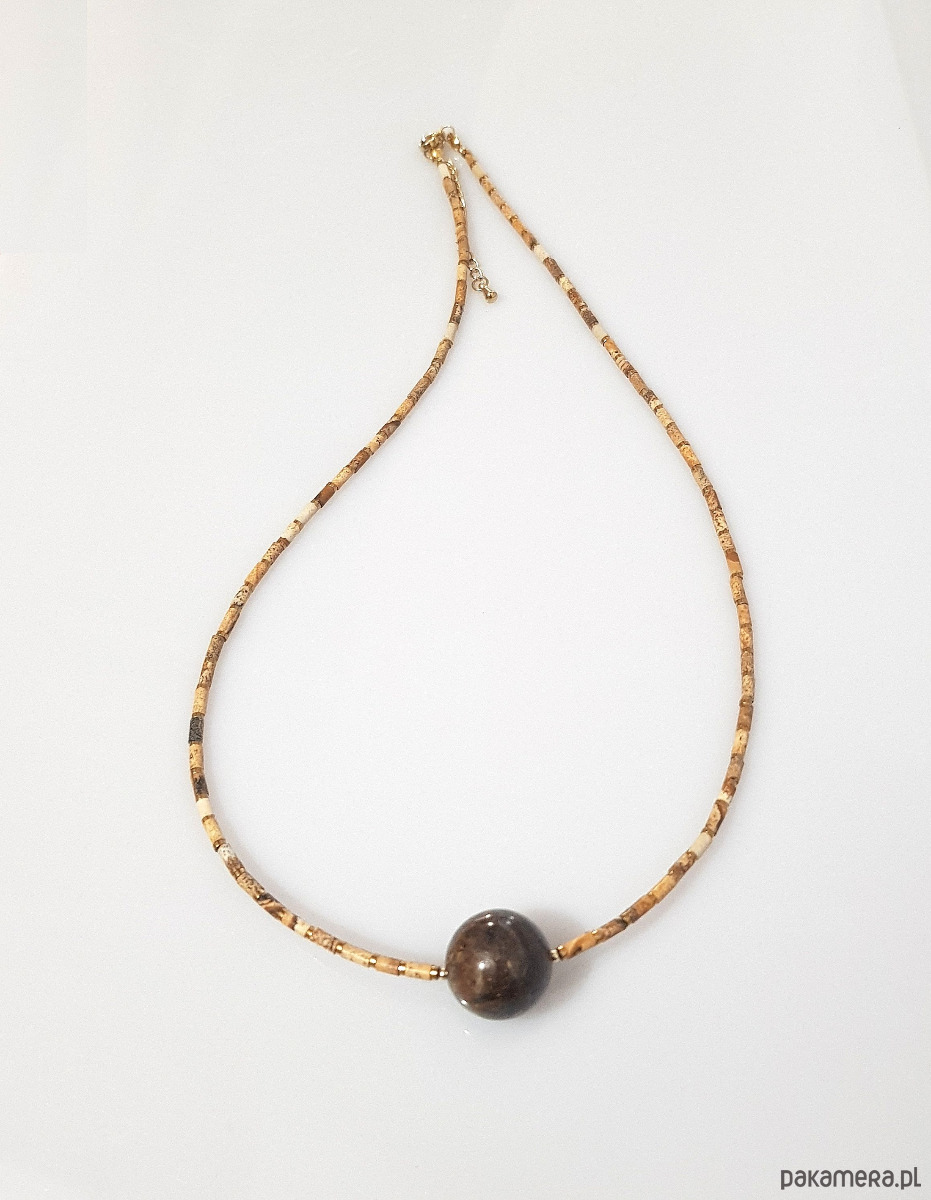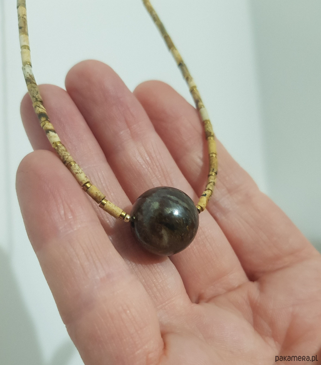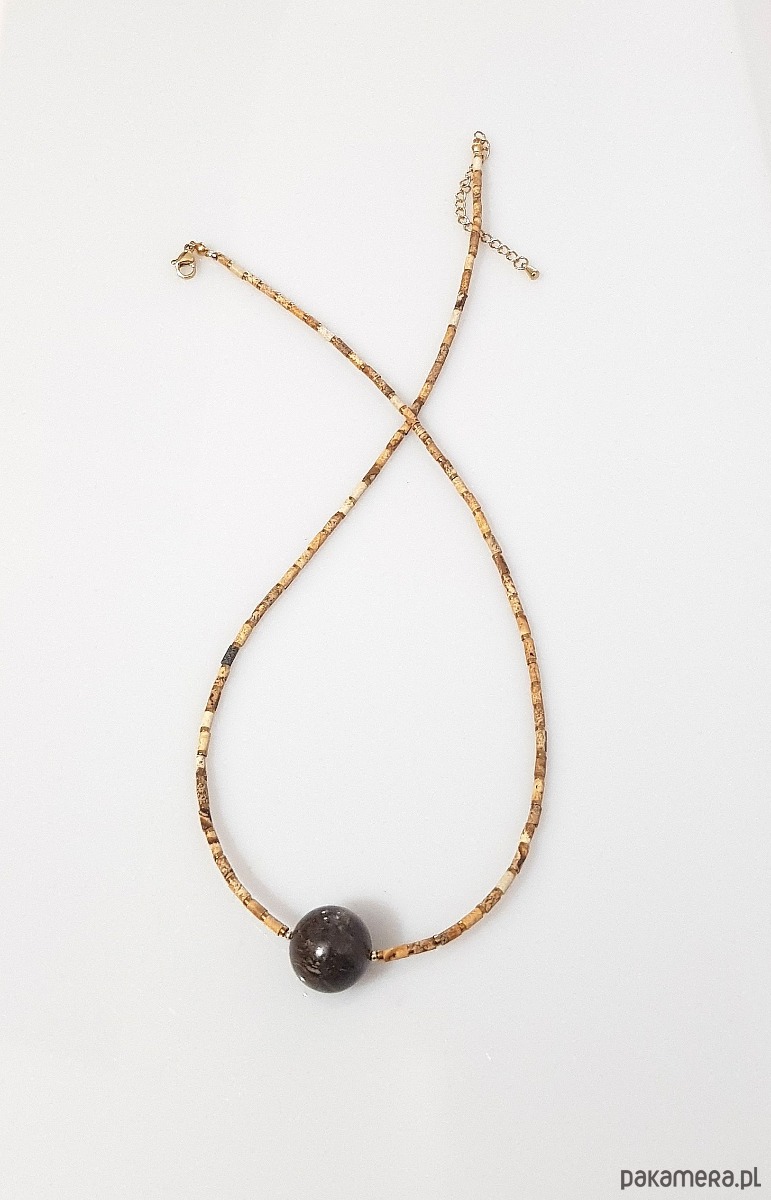 Zachwycający jaspis obrazkowy w formie drobnych wałeczków oddzielonych krążkami złotego hematytu i w roli głównej interesująca kula bronzytu,