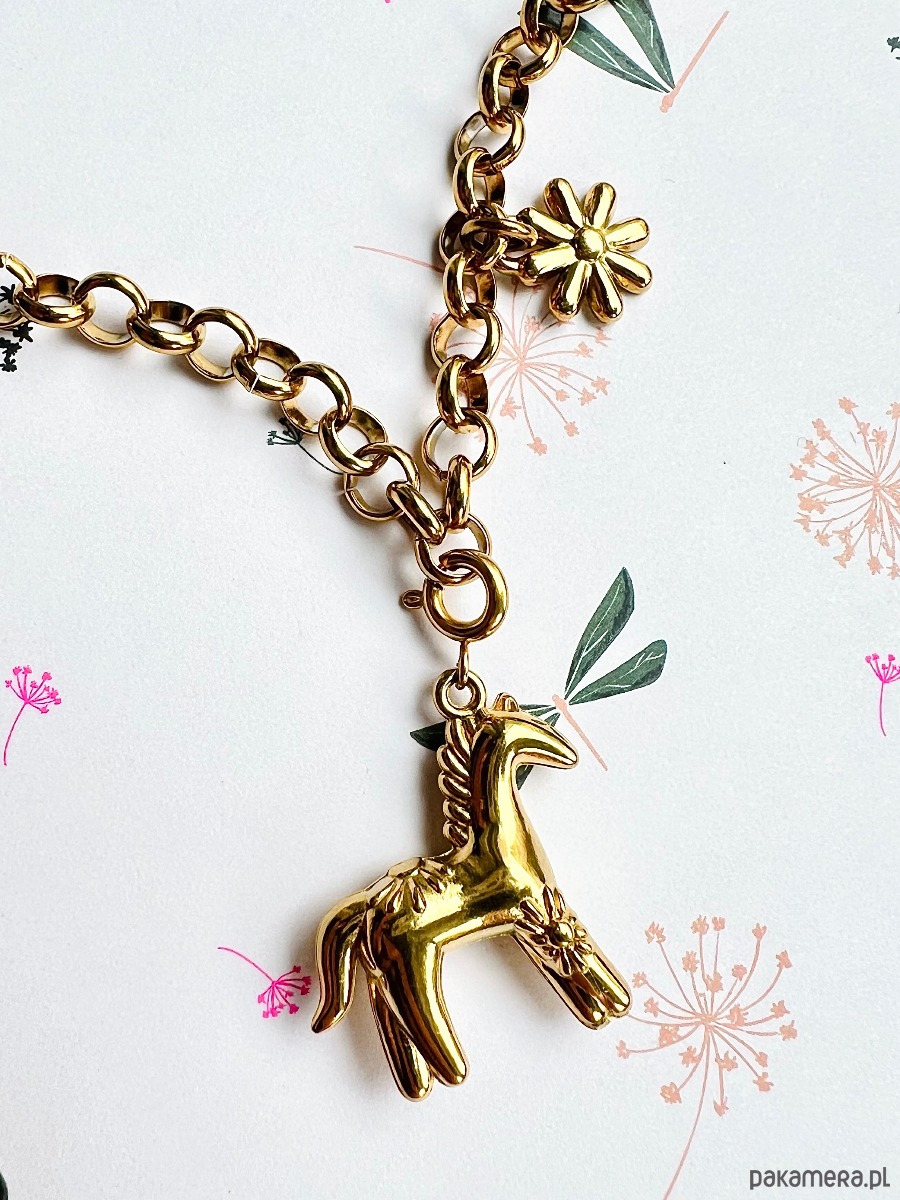Wykonany ze stali chirurgicznej grubszy łańcuszek ozdobiony jest zawieszką w kształcie konika oraz stokrotki. Konik odpina się i można go zamontować w dowolnym miejscu na naszyjniku, co daje nam wiele sposobów noszenia.