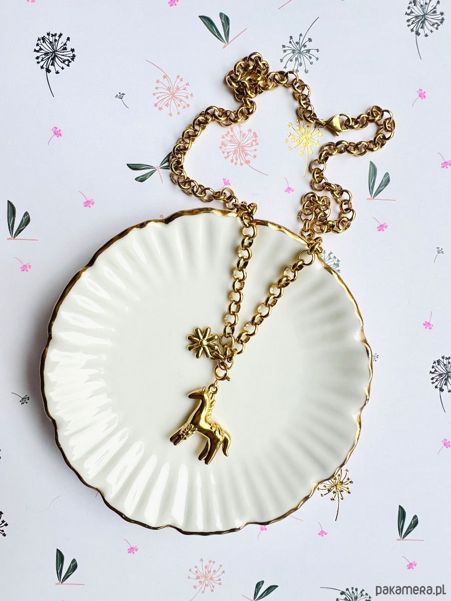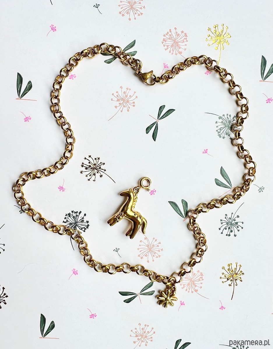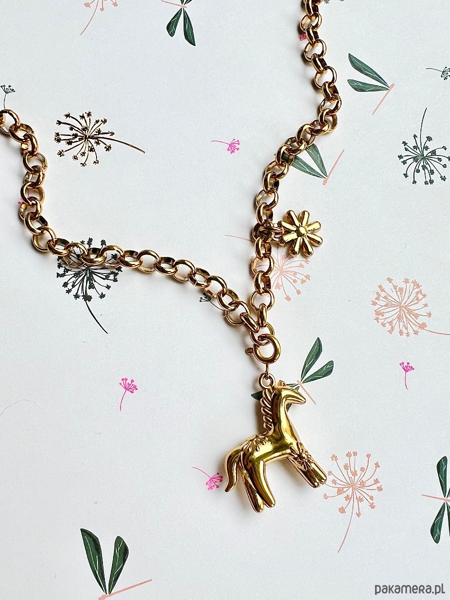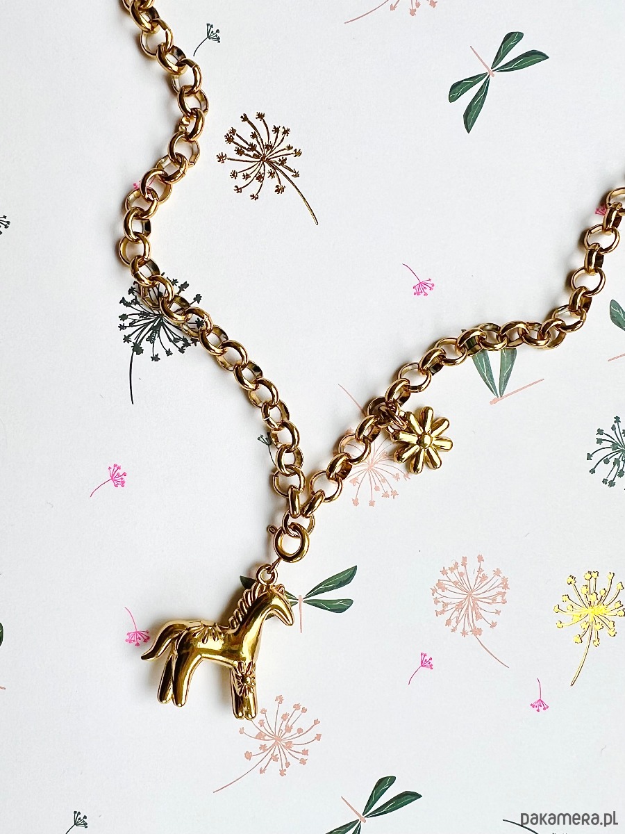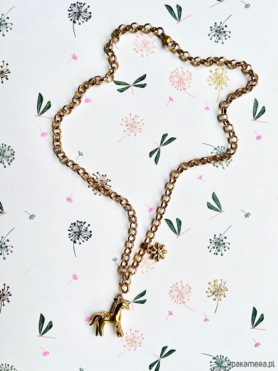 Wykonany ze stali chirurgicznej grubszy łańcuszek ozdobiony jest zawieszką w kształcie konika oraz stokrotki. Konik odpina się i można go zamontować w dowolnym miejscu na naszyjniku, co daje nam wiele sposobów noszenia.