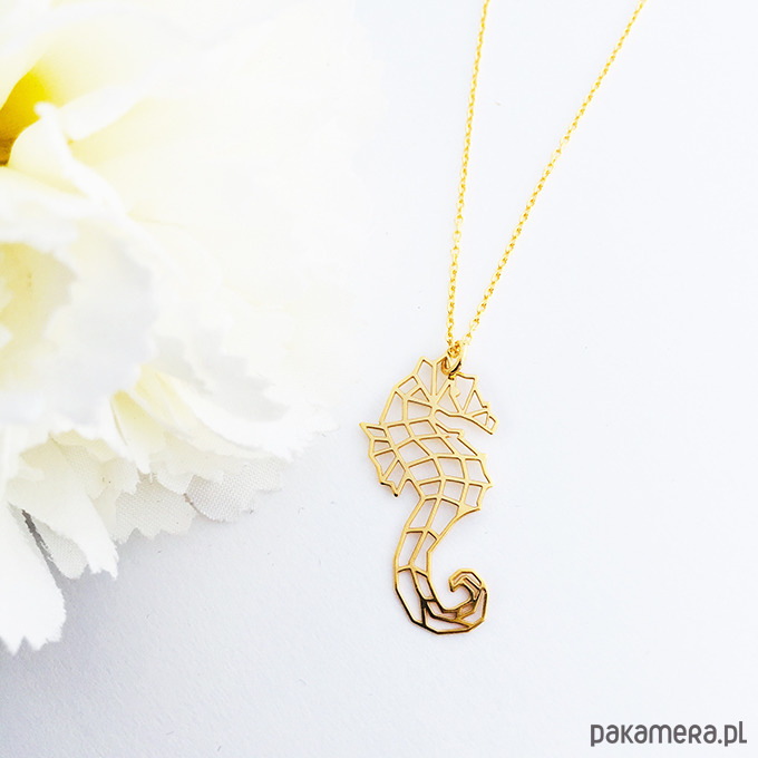 Zachwyć się unikatowym naszyjnikiem z geometrycznym konikiem morskim w stylu origami! Delikatny, złocony 24-karatowym złotem, wykonany ze srebra 925 — idealny letni akcent, który przyciąga wzrok. 🐚