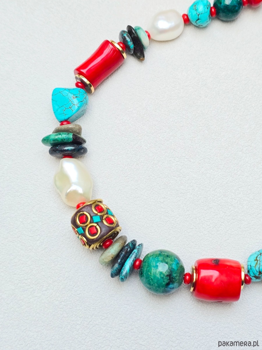 Wykorzystane kamienie: chryzokola, koral czerwony, bryłki howlitu turkusowego, perły naturalne, złocony hematyt