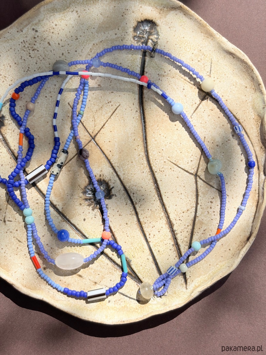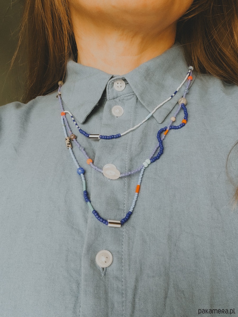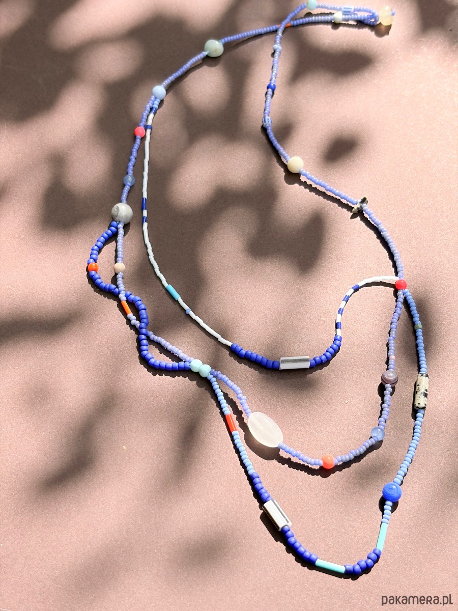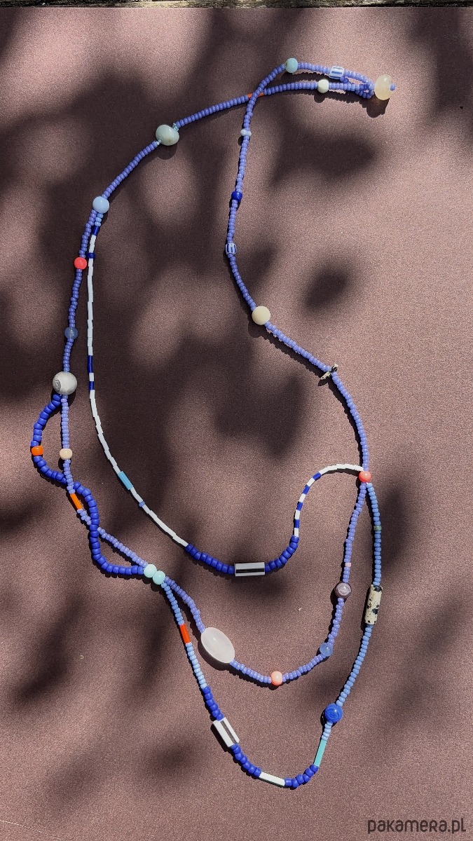 naszyjnik ze szklanych koralików czasem w towarzystwie kamieni naturalnych lub z dodatkiem koralików z odzysku wyszperanych na targach staroci, długość regulowana można swobodnie dobierać długość naszyjnika do stylizacji. Możesz nosić krócej tuż przy szyi lub przedłużyć. Zapięcie pozwala uzyskać dwie długości.