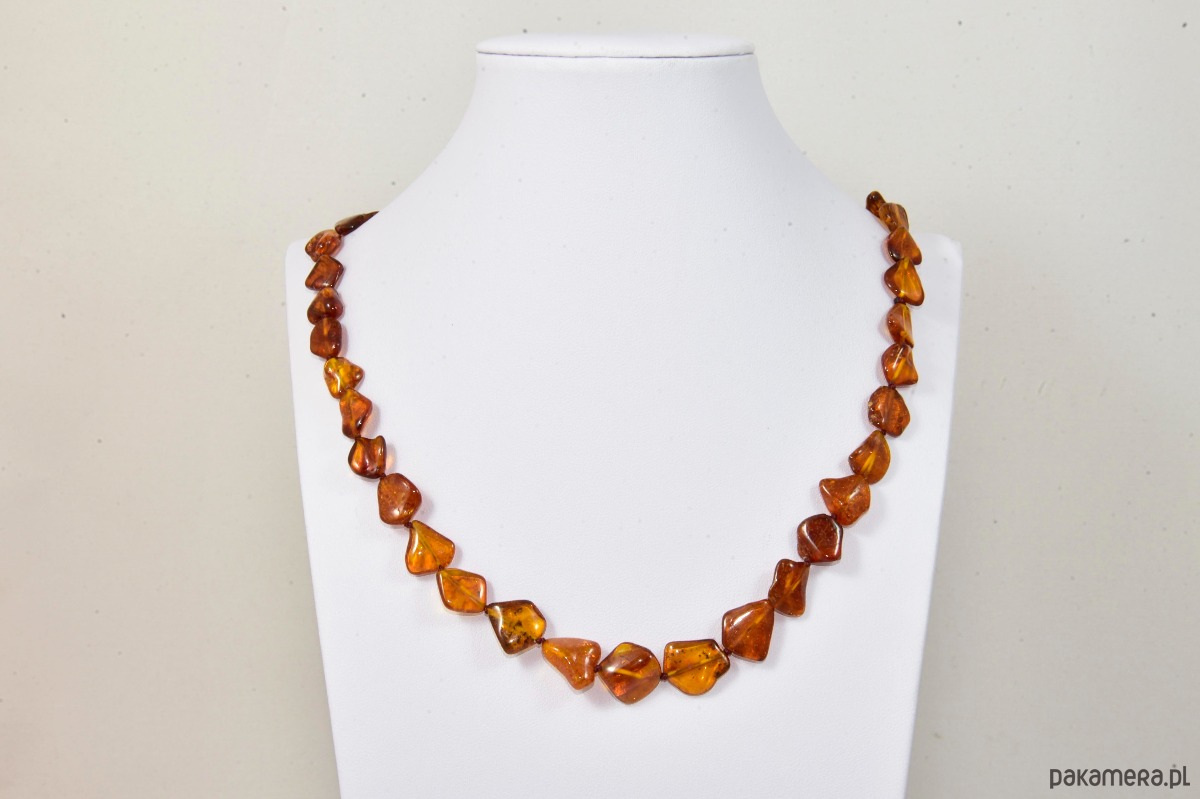 Uroczy naszyjnik z pięknych kamyków bursztynu. Delikatne bursztynowe listki w koniakowym kolorze sprawiają, że wygląda lekko i romantycznie. Będzie pięknym uzupełnieniem każdej kreacji.