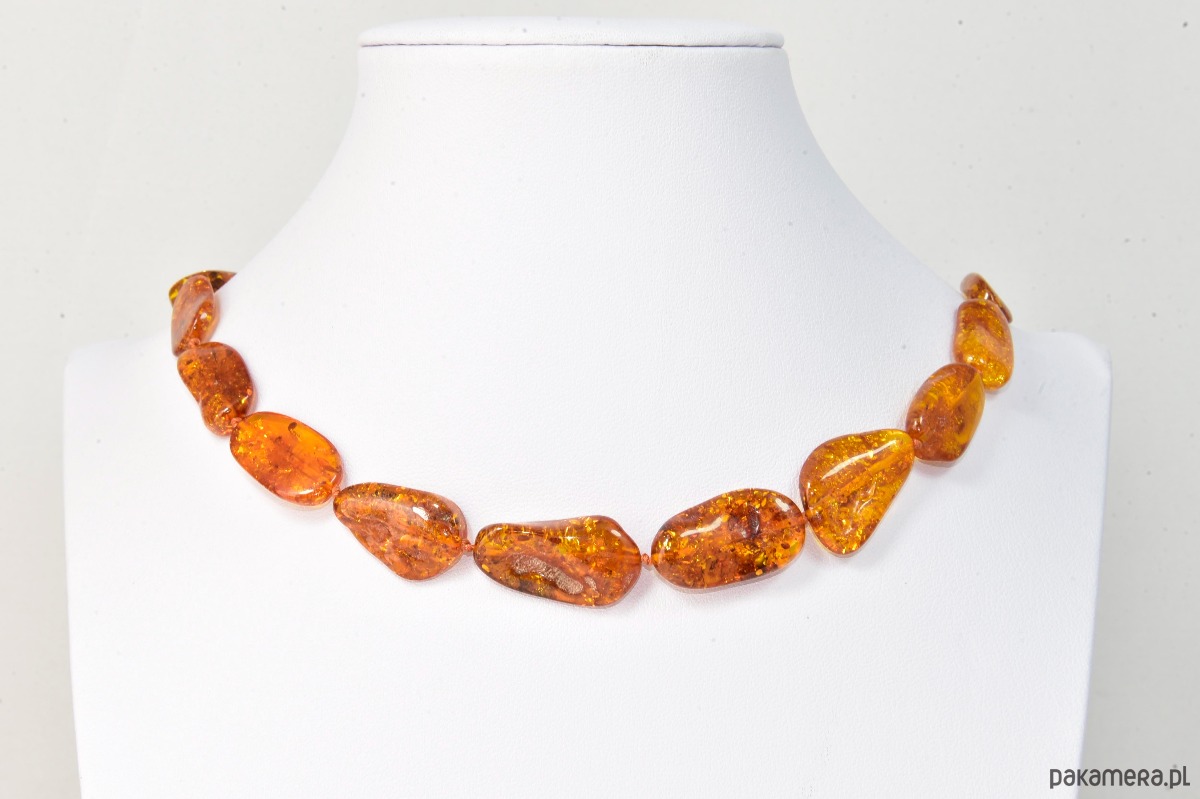 To wyjątkowo piękne korale z oszlifowanego bursztynu, w idealnym koniakowym kolorze. Ukryte w kamieniach inkluzje tworzą niepowtarzalne kompozycje.