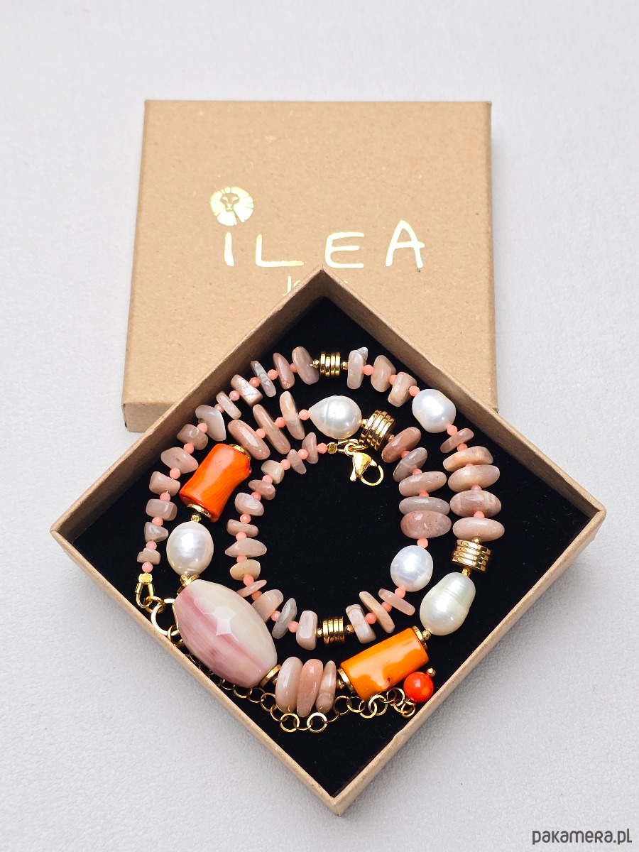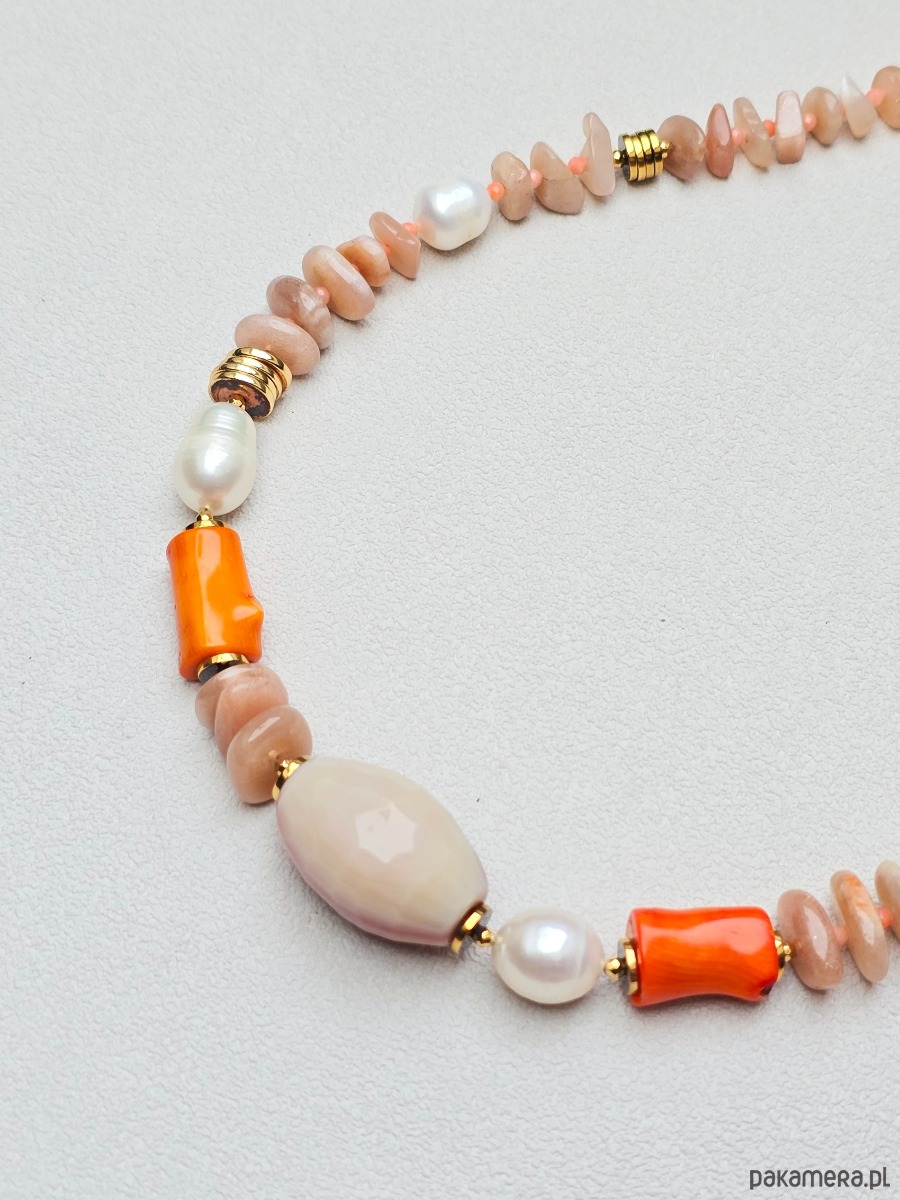 Wykorzystane kamienie: kamień słoneczny, koral pomarańczowy, perły naturalne, złocony hematyt