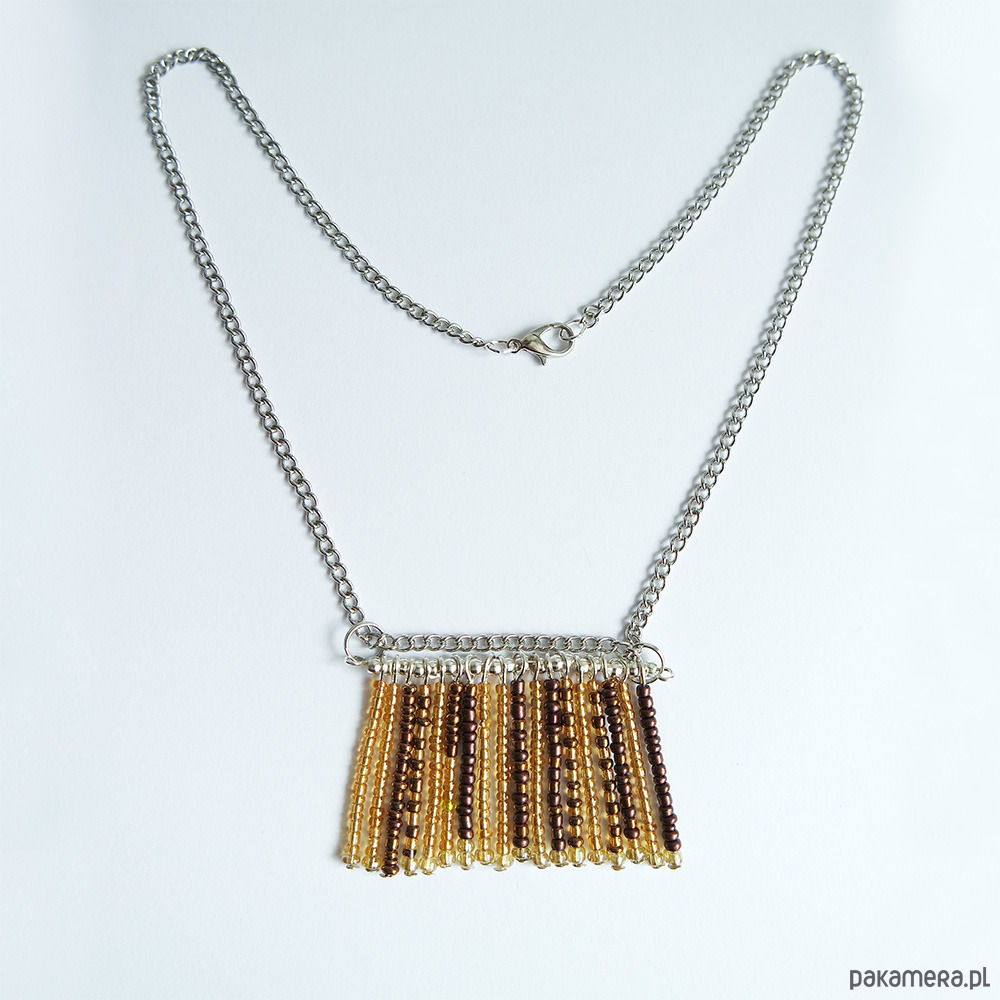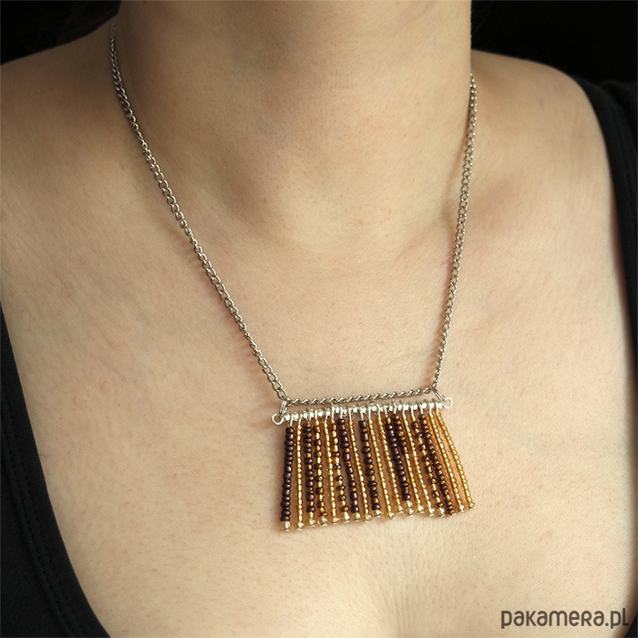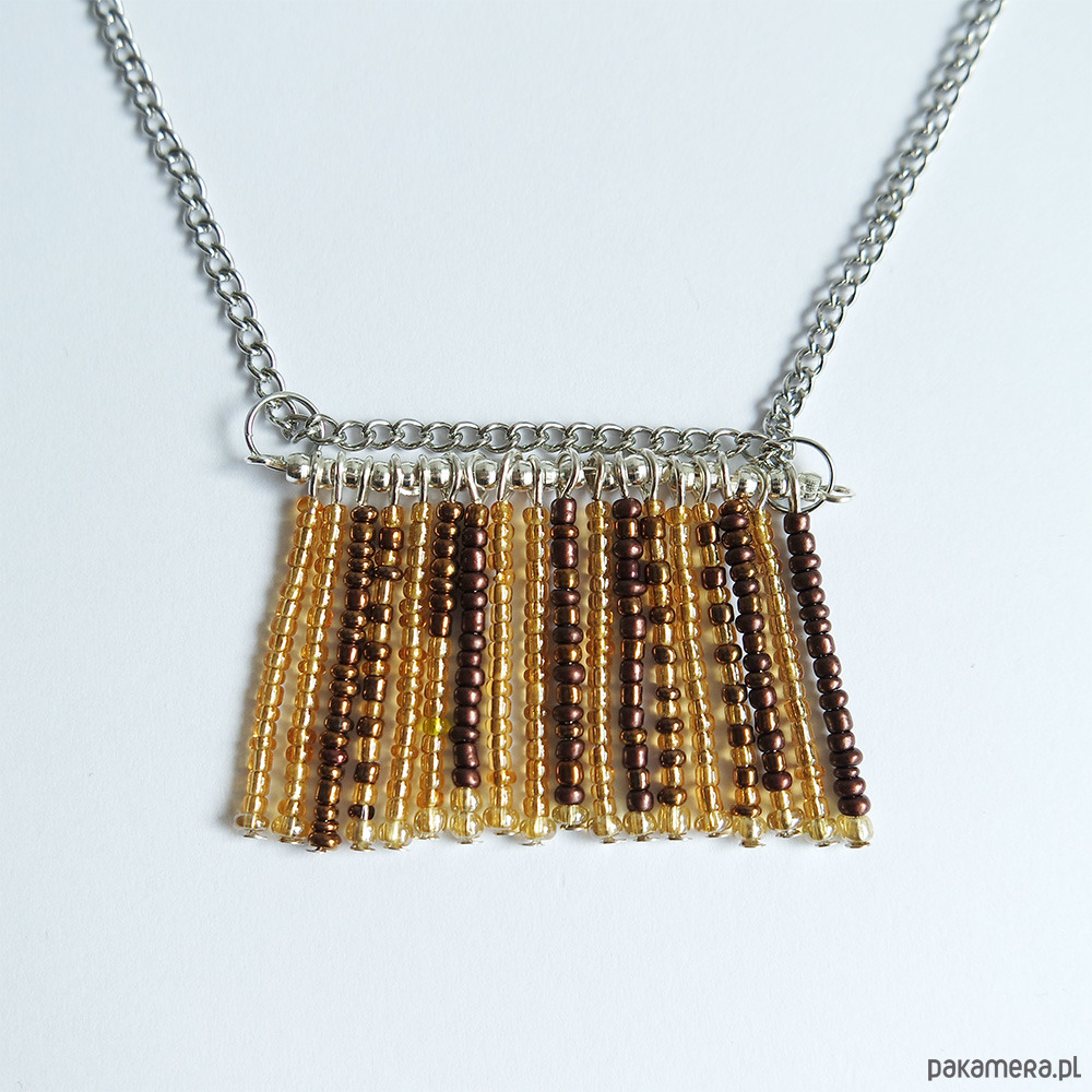 Naszyjnik z kompozycją z małych koralików w odcieniach brązu oraz złota.