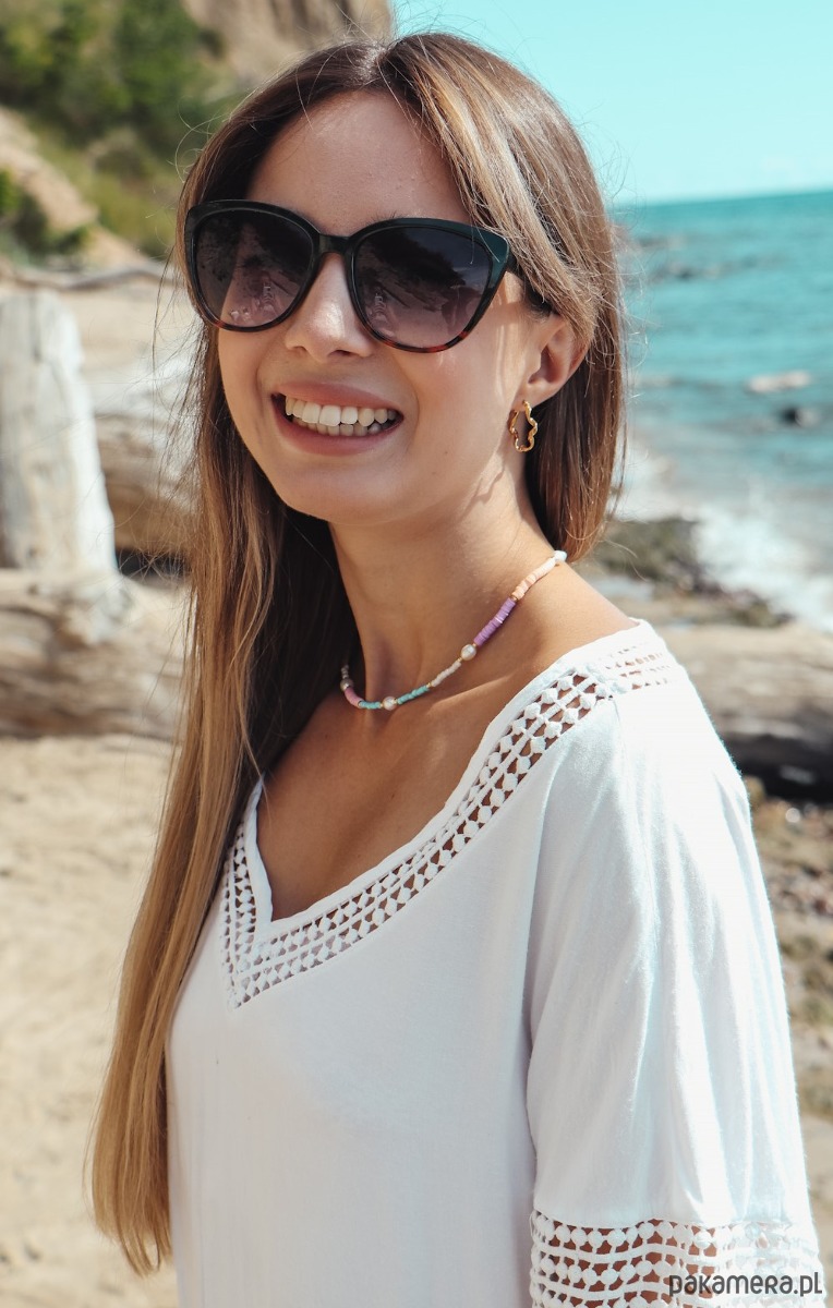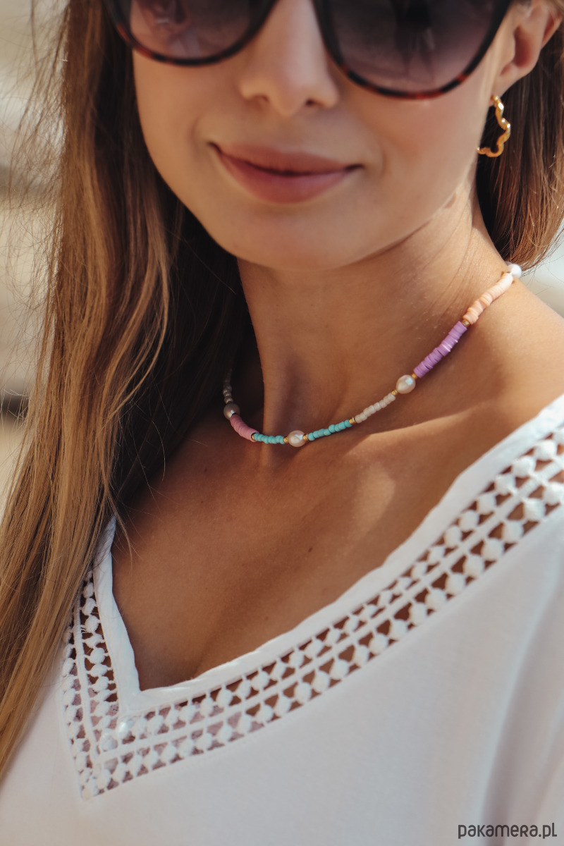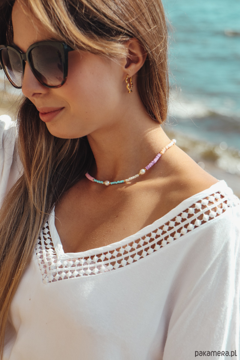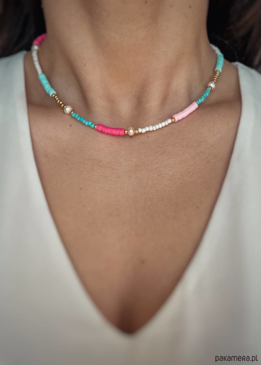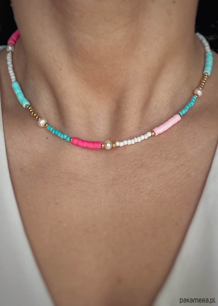 Idealny, wakacyjny naszyjnik! Połączenie koralików Katsuki o przepięknych, głębokich kolorach różu i niebieskiego, koralików Toho w kolorze białym i złotym oraz Pereł Naturalnych. Idealny pomysł na wakacyjny dodatek. Przepięknie będzie komponował się z wakacyjnymi stylizacjami i ze strojami kąpielowymi. Żywe kolory są aktualnie niesamowicie modne, dodają charakteru i uroku. Naszyjnik posiada również przedłużkę o długości około 3 cm.