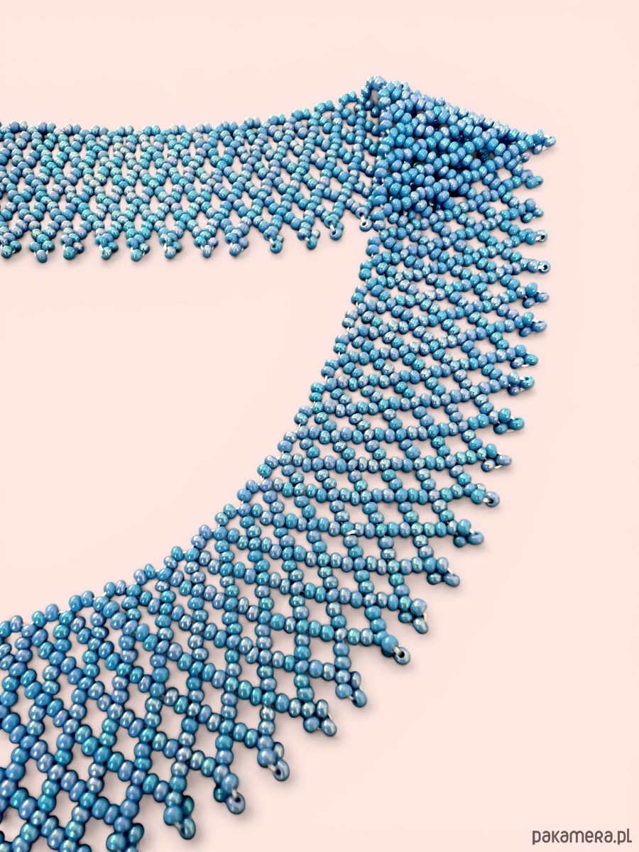 Naszyjnik koralikowy, ażurowy kołnierzyk folk, łemkowska krywulka, błękitny