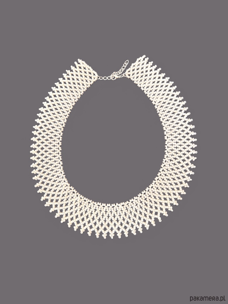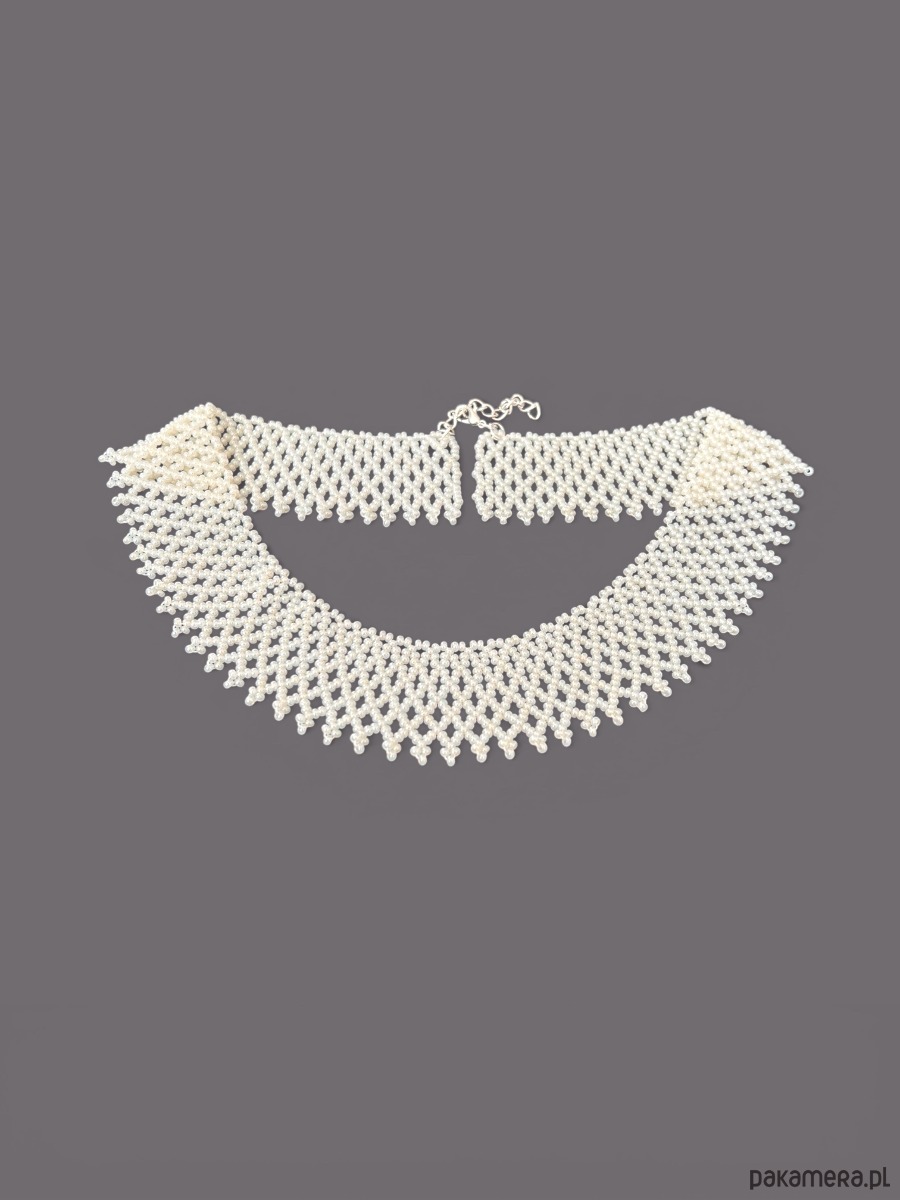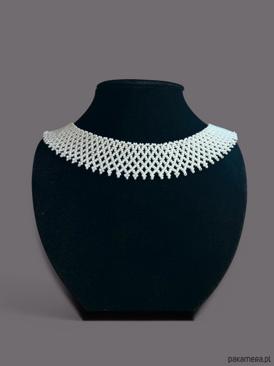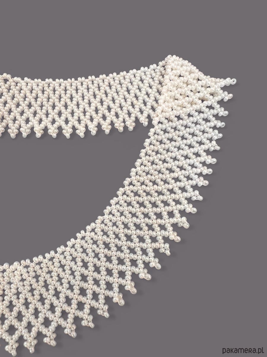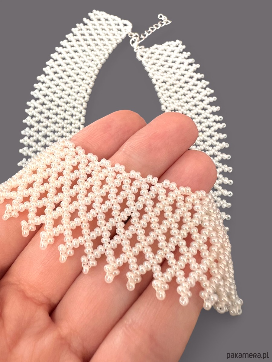 Ręcznie wykonany z drobnego czeskiego koralika, tworzy subtelną, ażurową formę przypominającą elegancki kołnierzyk / kolię.
