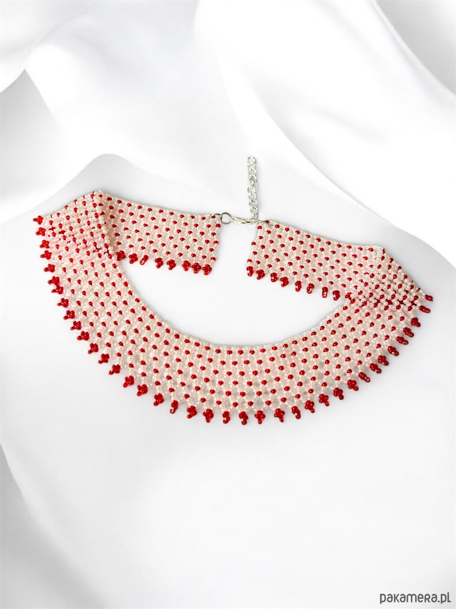Elegancki naszyjnik koralikowy Lemkowska Krywulka w kolorze mlecznym z czerwonymi akcentami. Ręcznie wykonana techniką wyplatania z koralików, stanowi wyjątkowy przykład biżuterii folkowej inspirowanej tradycją łemkowską.