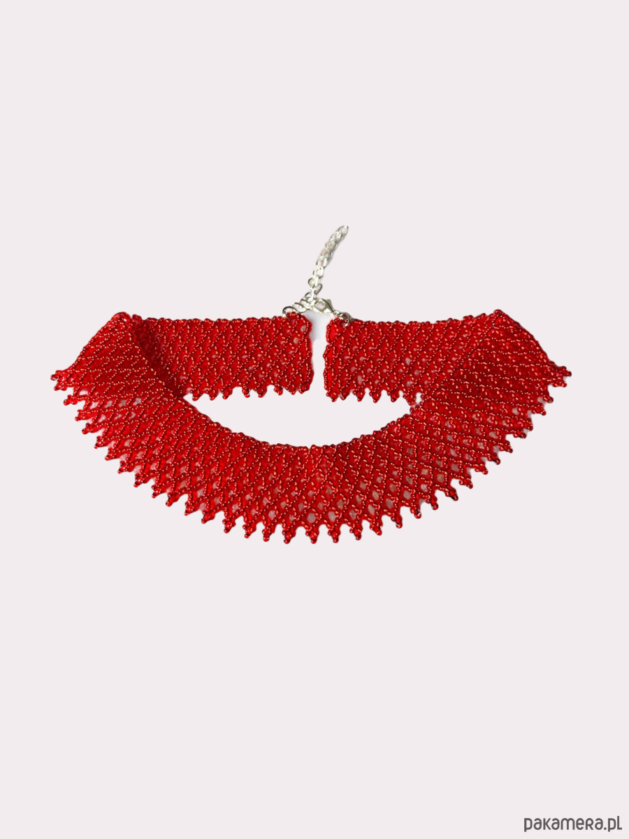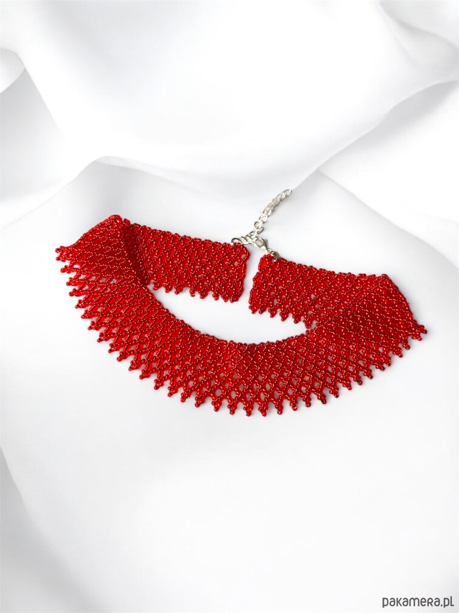 Wyjątkowy naszyjnik koralikowy Lemkowska Krywulka wykonany z błyszczących czerwonych koralików. To tradycyjna biżuteria folkowa, inspirowana sztuką łemkowską i ręcznie stworzona techniką wyplatania z koralików.