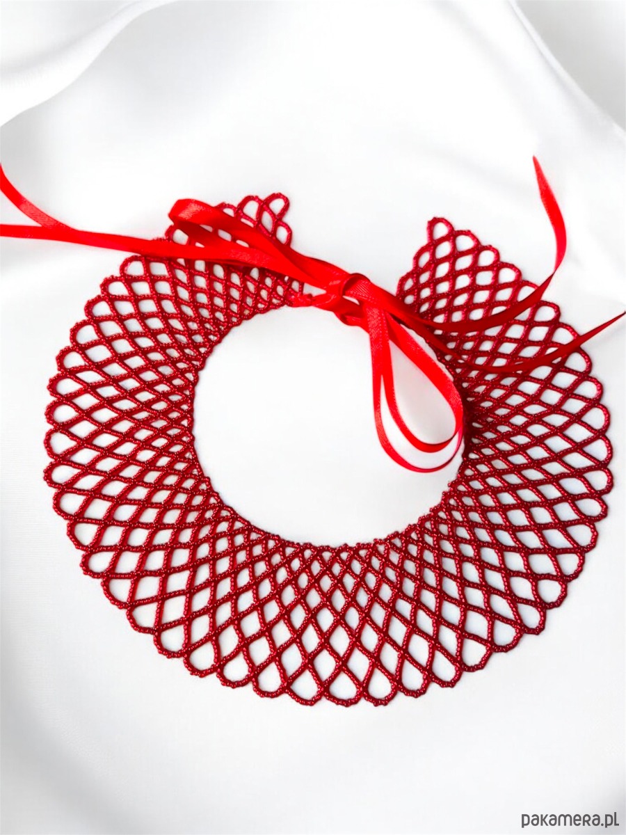 Naszyjnik ma długość 38 cm, ale dzięki eleganckim, satynowym wiązaniom w kolorze czerwonym, można go regulować i wydłużyć aż do 48 cm. Szerokość wynosi 5,5 cm, co sprawia, że prezentuje się bardzo efektownie, a przy tym lekko i kobieco.