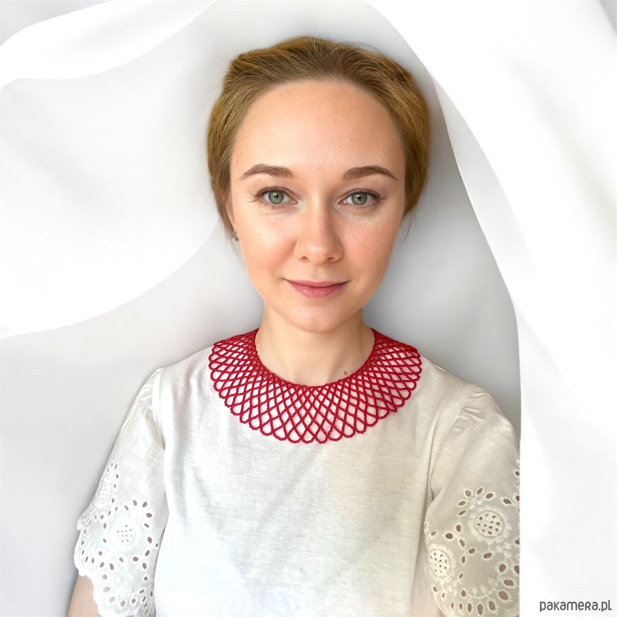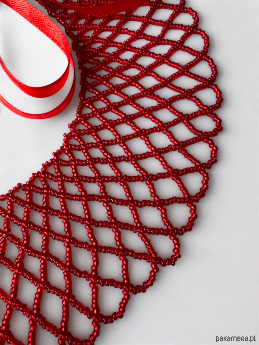 Zachwycający, ręcznie wykonany naszyjnik z matowego, bordowego czeskiego koralika. Jego misternie pleciony, ażurowy wzór pięknie układa się na dekolcie i przyciąga spojrzenia. To wyjątkowy dodatek w stylu etnicznym i boho – doskonały na wieczorne wyjścia, wesela lub jako niepowtarzalny prezent dla miłośniczki unikalnej biżuterii.