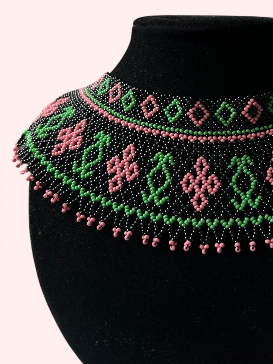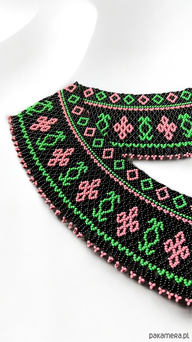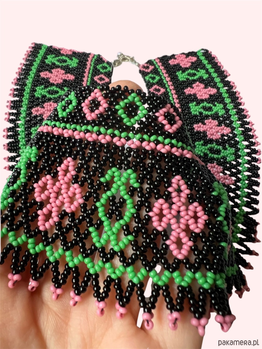 Ten wyjątkowy naszyjnik w stylu Łemkowskim to połączenie tradycji i nowoczesności. Wykonany z drobnych koralików w żywych odcieniach różu i zieleni na czarnym tle, tworzy efektowny kwiatowy wzór.