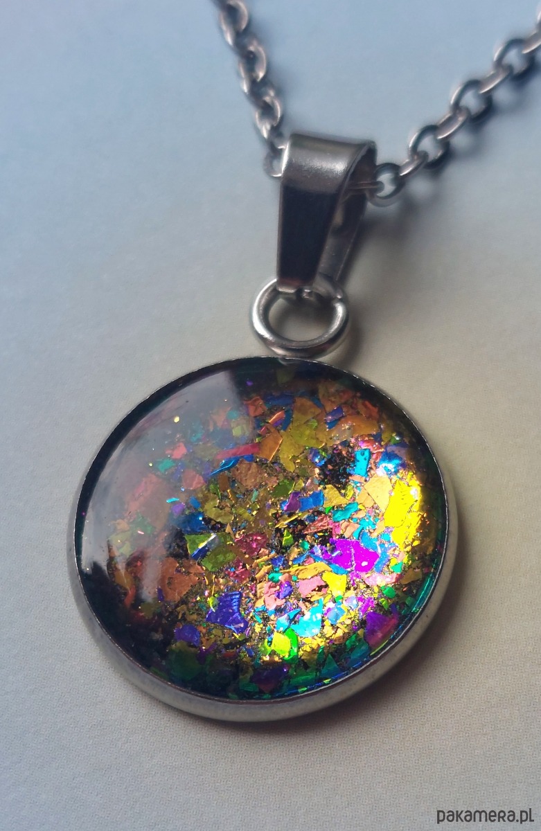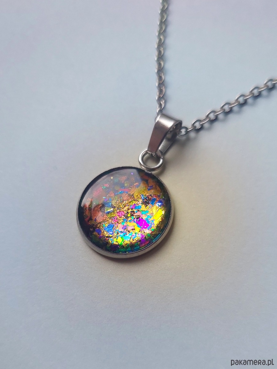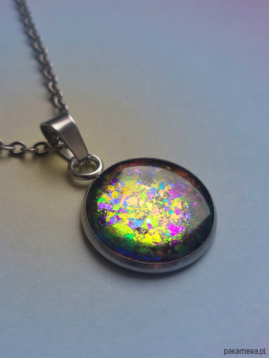 Naszyjnik z mieniącym się na wiele kolorów wisiorkiem.
