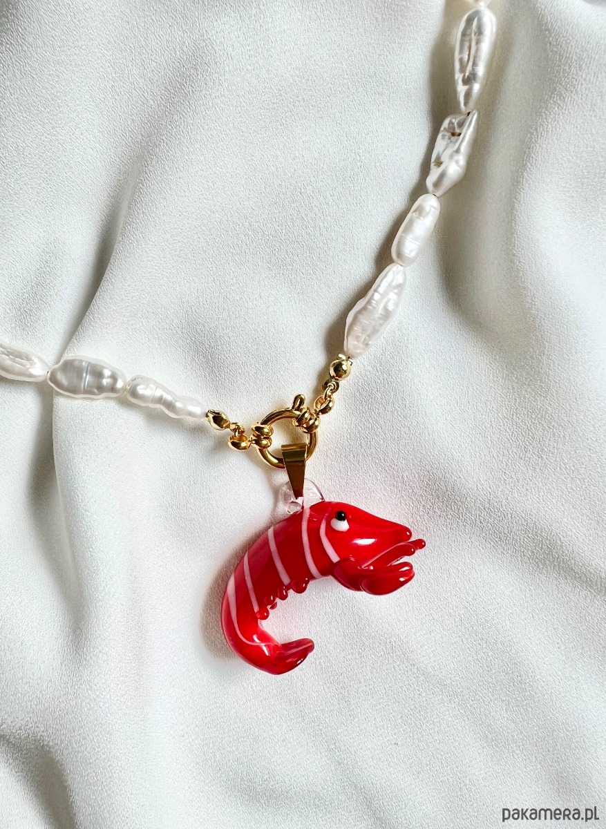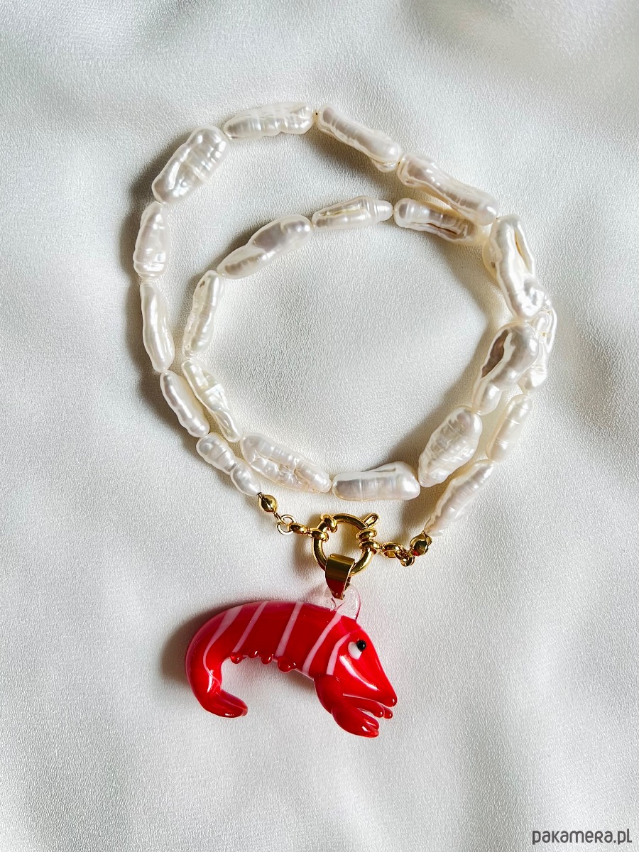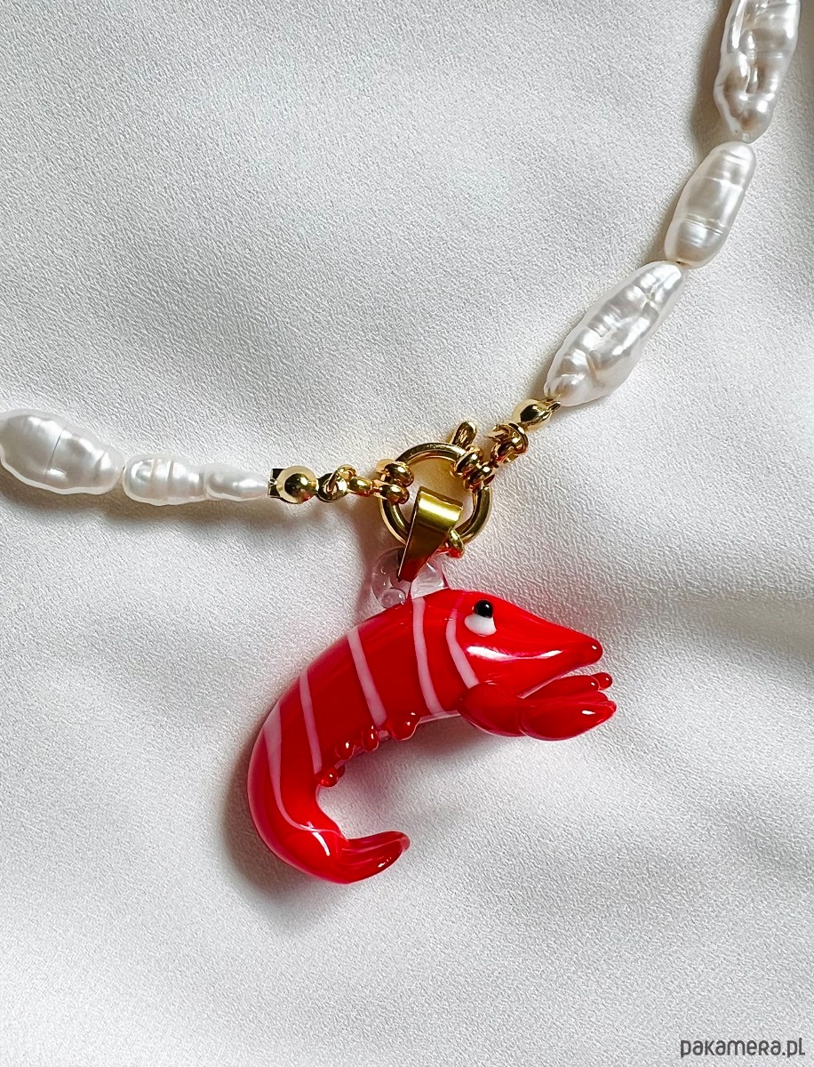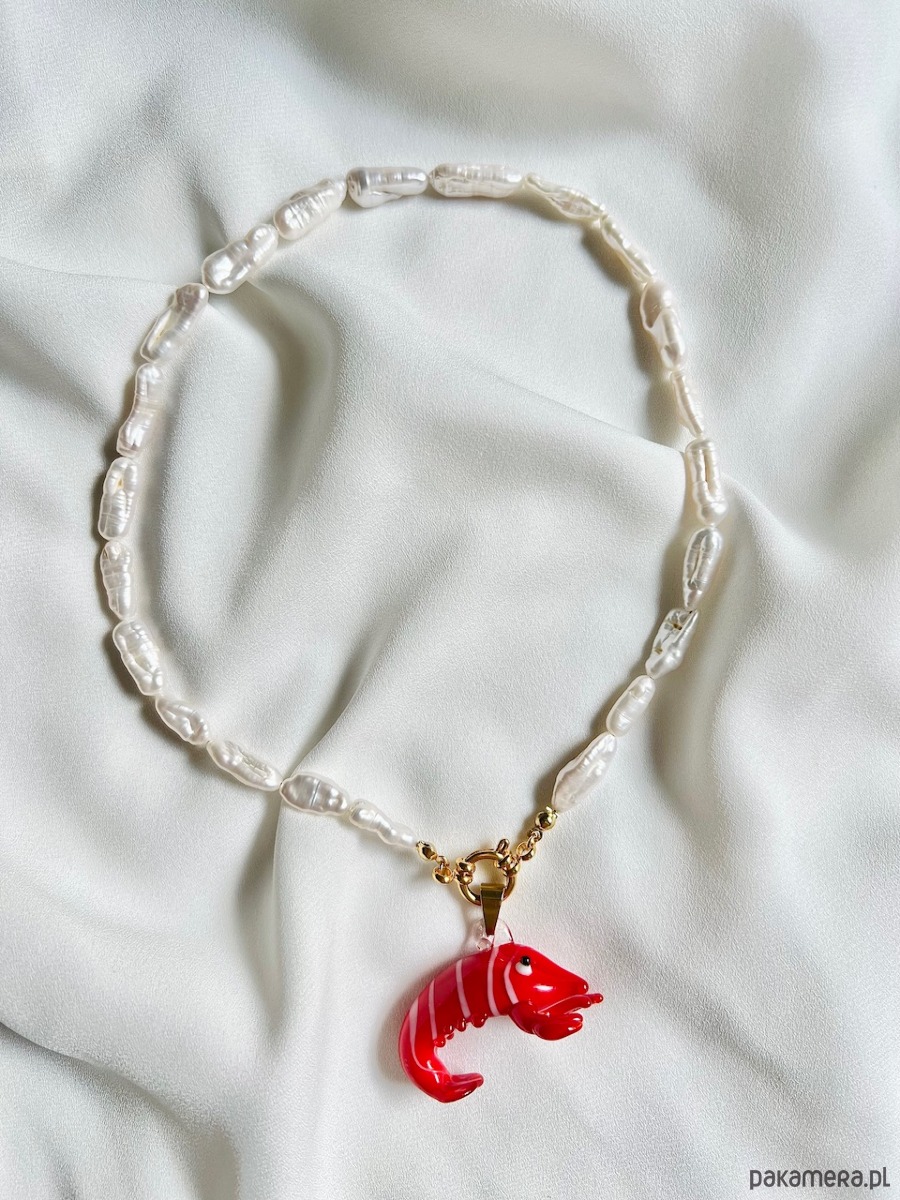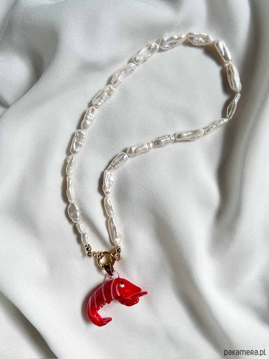 Wykonany z dużych pereł naturalnych hodowlanych o ciekawym, nieregularnym kształcie oraz czerwonej szklanej krewetki. Krewetkę można odpiąć od naszyjnika, dzięki temu Ty decydujesz, czy wbrać klasykę, czy odrobinę „szaleństwa” i humoru!