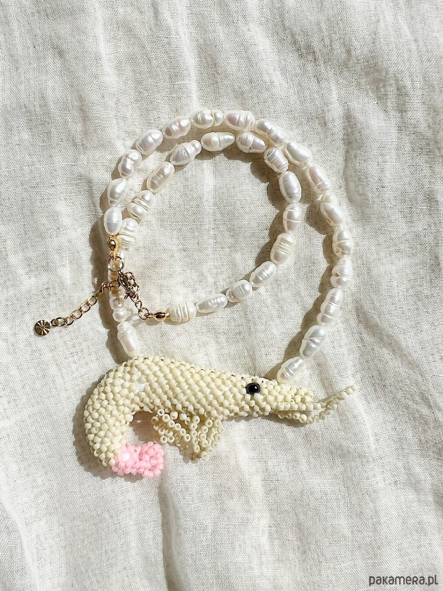 Wykonany z pereł naturalnych hodowlanych oraz pięknej, kremowej krewetki, która została ręcznie wypleciona ze szklanych koralików. Całość wykończona stalą chirurgiczną .