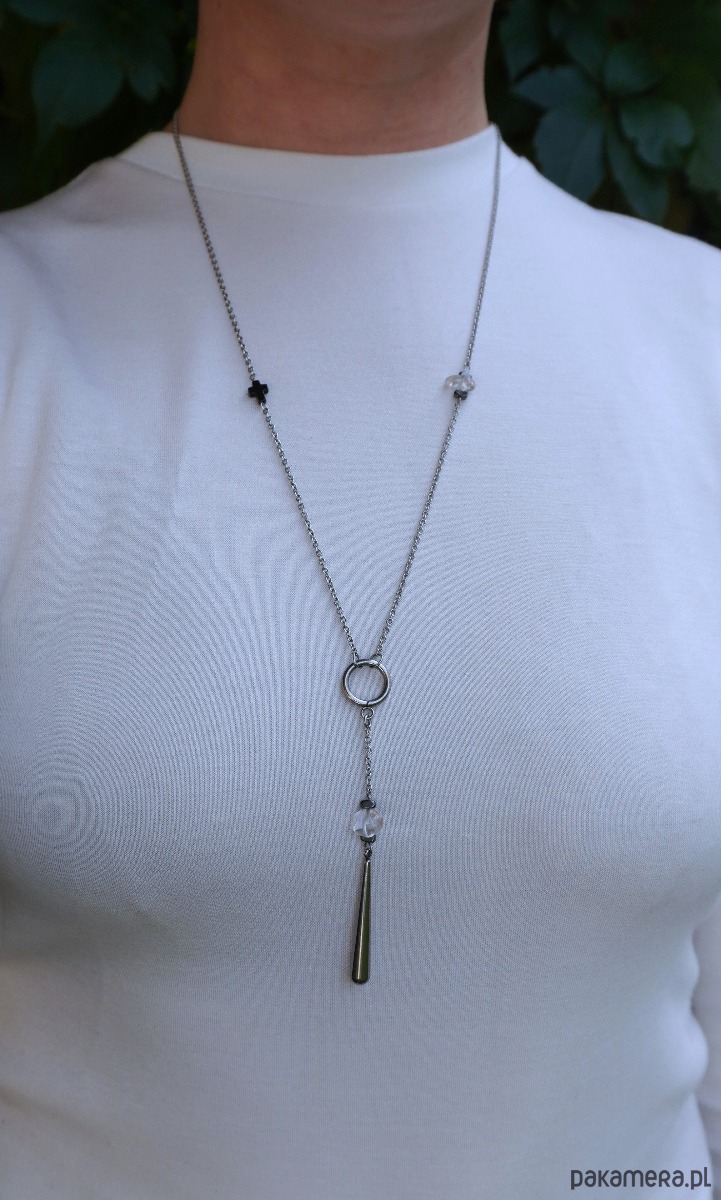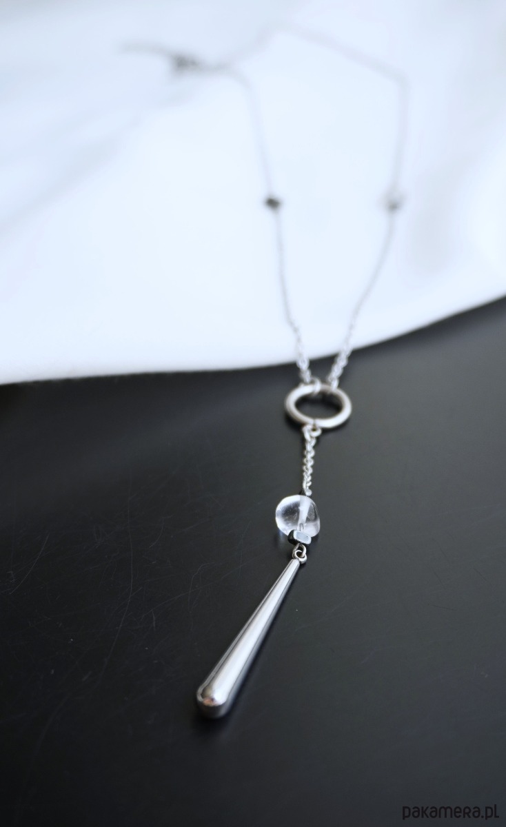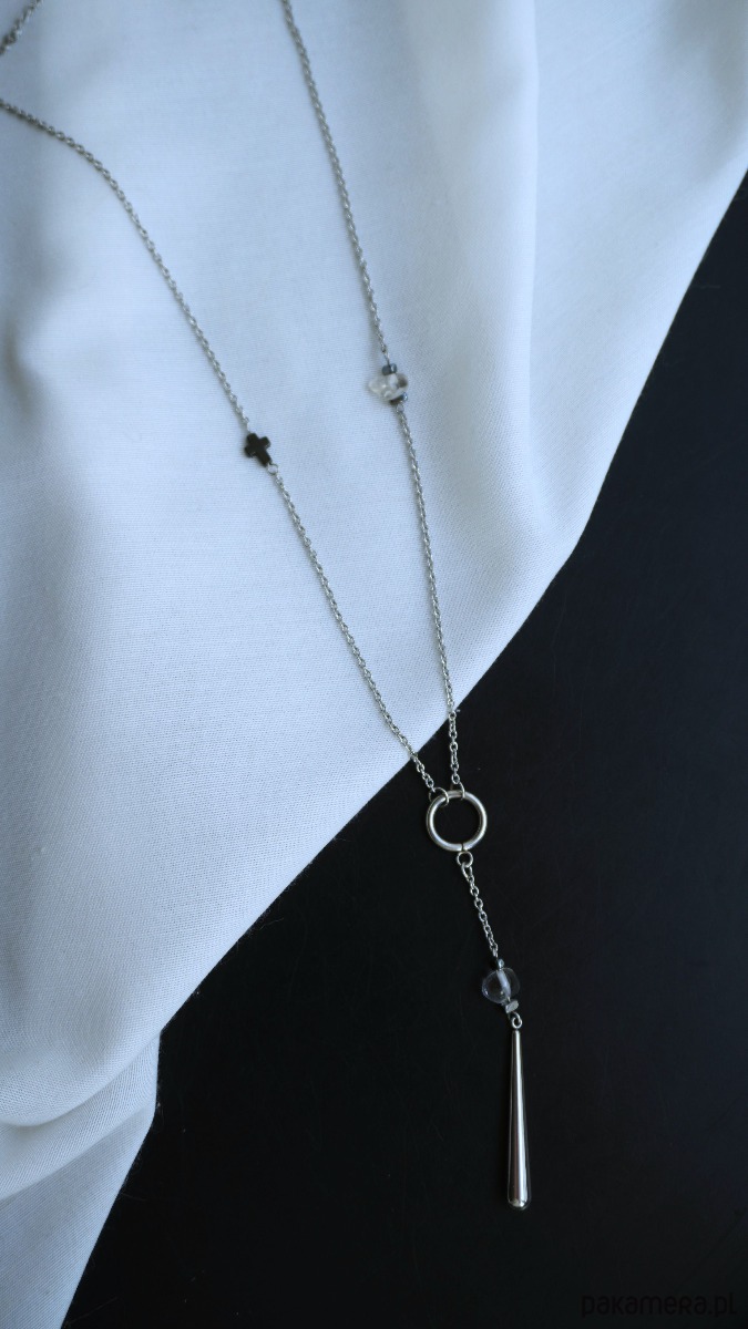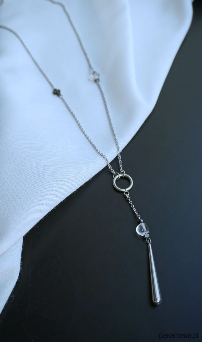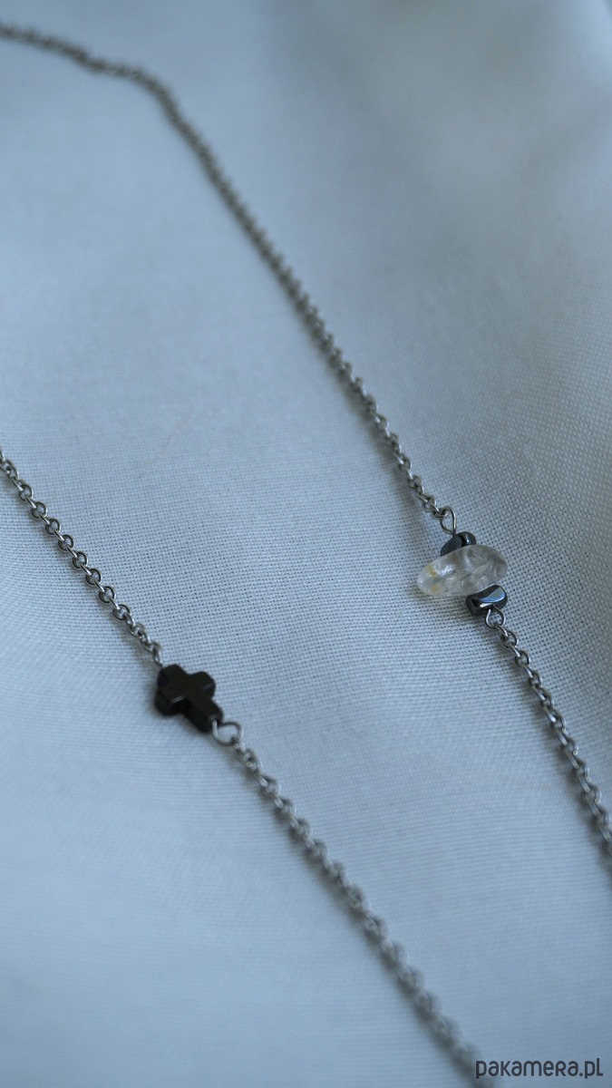Delikatny naszyjnik na subtelnym metalowym łańcuszku z akcentem w postaci zawieszki – wydłużonego metalowego elementu ozdobionego koralikiem z kryształu górskiego z dodaniem hematytu. Na łańcuszku znajdują się również wstawki z naturalnego kryształu górskiego, hematytu oraz mały krzyżyk z czarnego turmalinu, które tworzą harmonijną równowagę między światłem i ciemnością, przejrzystością i głębią.