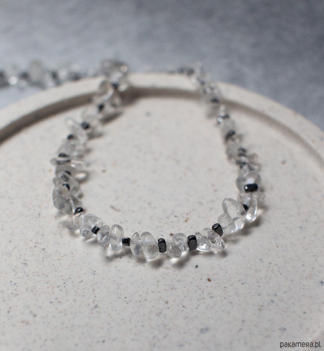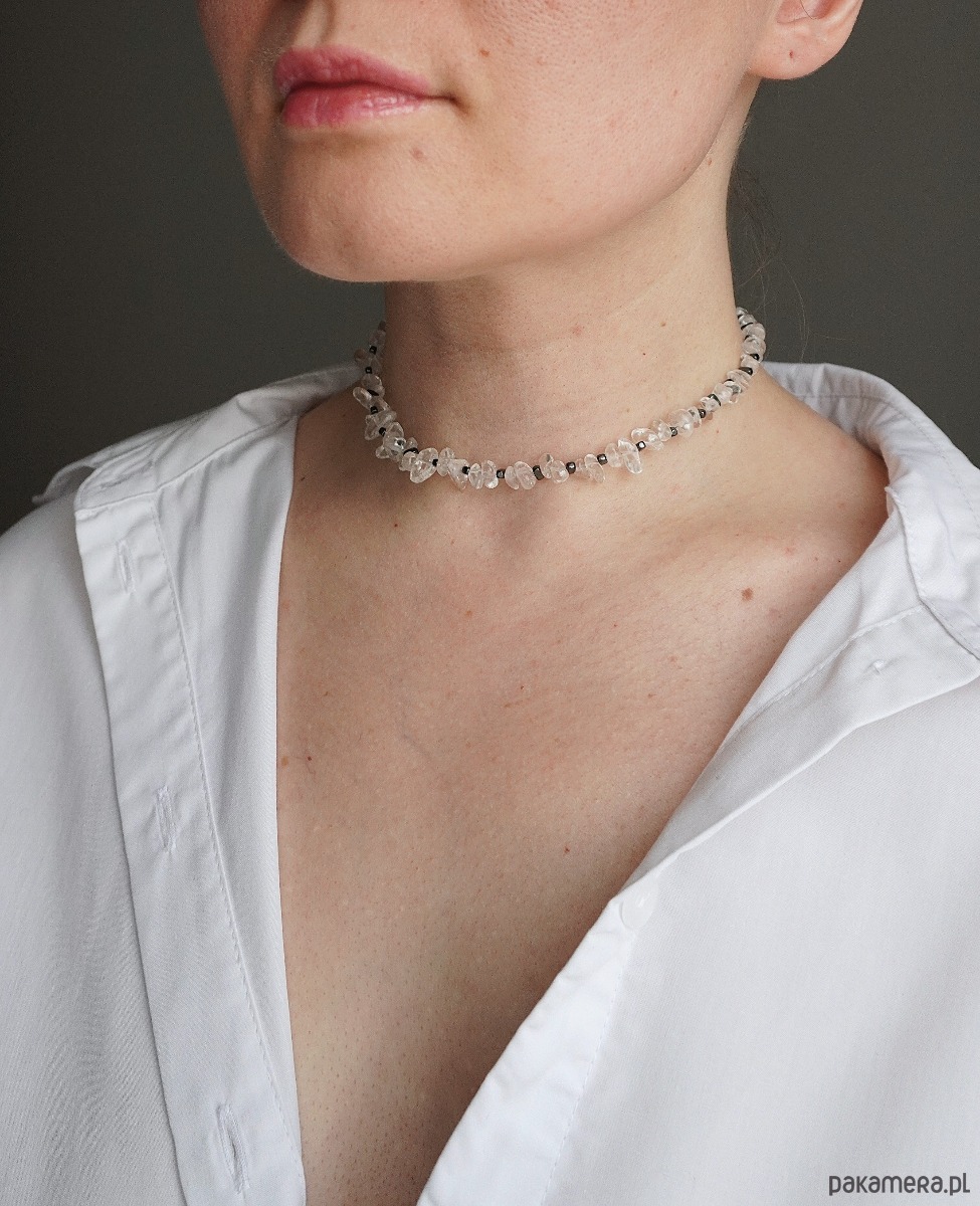 Naszyjnik wykonany jest z krystalicznie czystego kryształu górskiego i jest uzupełniony wstawkami z ciemnego hematytu, które tworzą harmonijny kontrast. Lekki, pełen wdzięku i stylowy choker nadaje się zarówno do codziennych stylizacji, jak i na specjalne okazje.