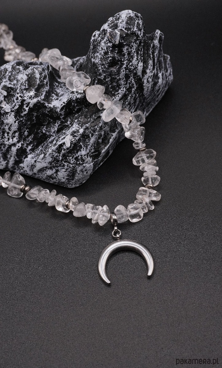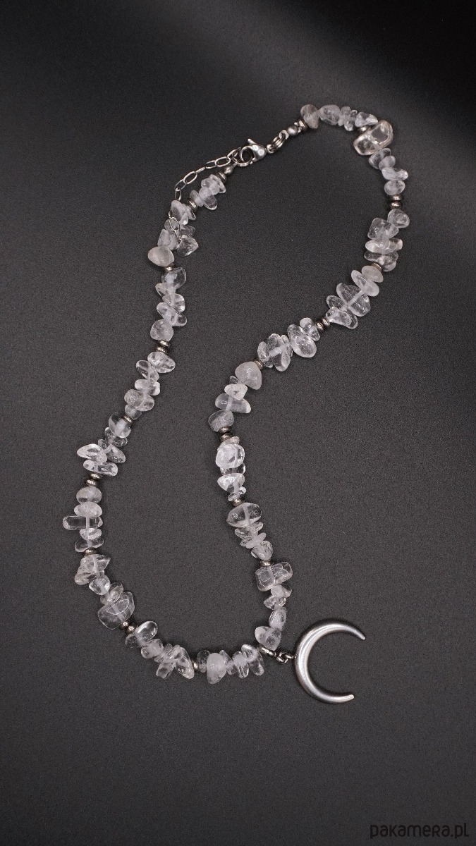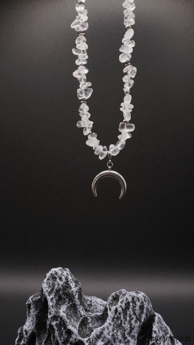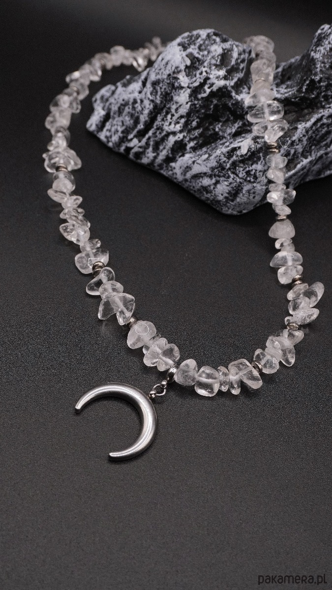 Centralnym elementem jest zawieszka w kształcie półksiężyca w srebrzystym kolorze, symbolizująca odnowę, intuicję i wewnętrzną siłę. Naszyjnik prezentuje się elegancko i nowocześnie, doskonale uzupełniając zarówno codzienne stylizacje, jak i bardziej wyrafinowane zestawy.