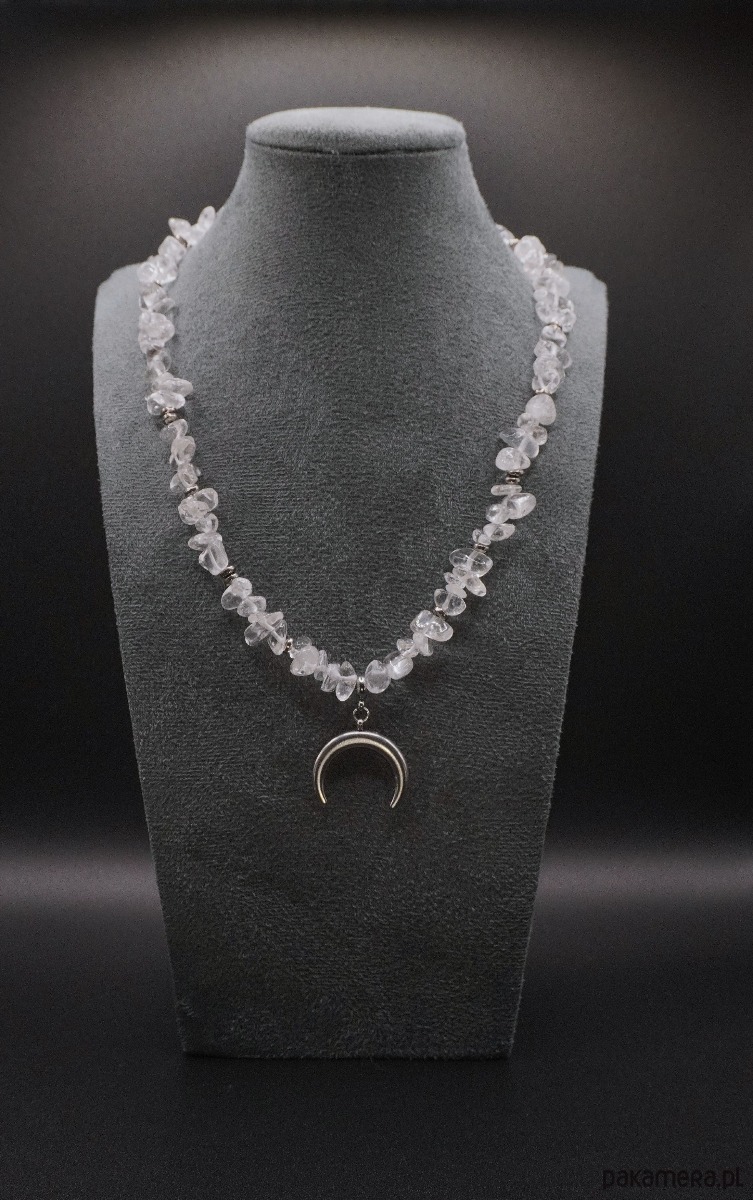Subtelny naszyjnik wykonany z naturalnego kryształu górskiego w formie nieobrobionych koralików, które tworzą efekt lekkości i naturalnego blasku. Przezroczyste kamienie pięknie załamują światło, nadając biżuterii zwiewny, czysty i harmonijny charakter. Akcenty z hematytu o delikatnym metalicznym połysku dodają kompozycji głębi oraz wizualnej równowagi.