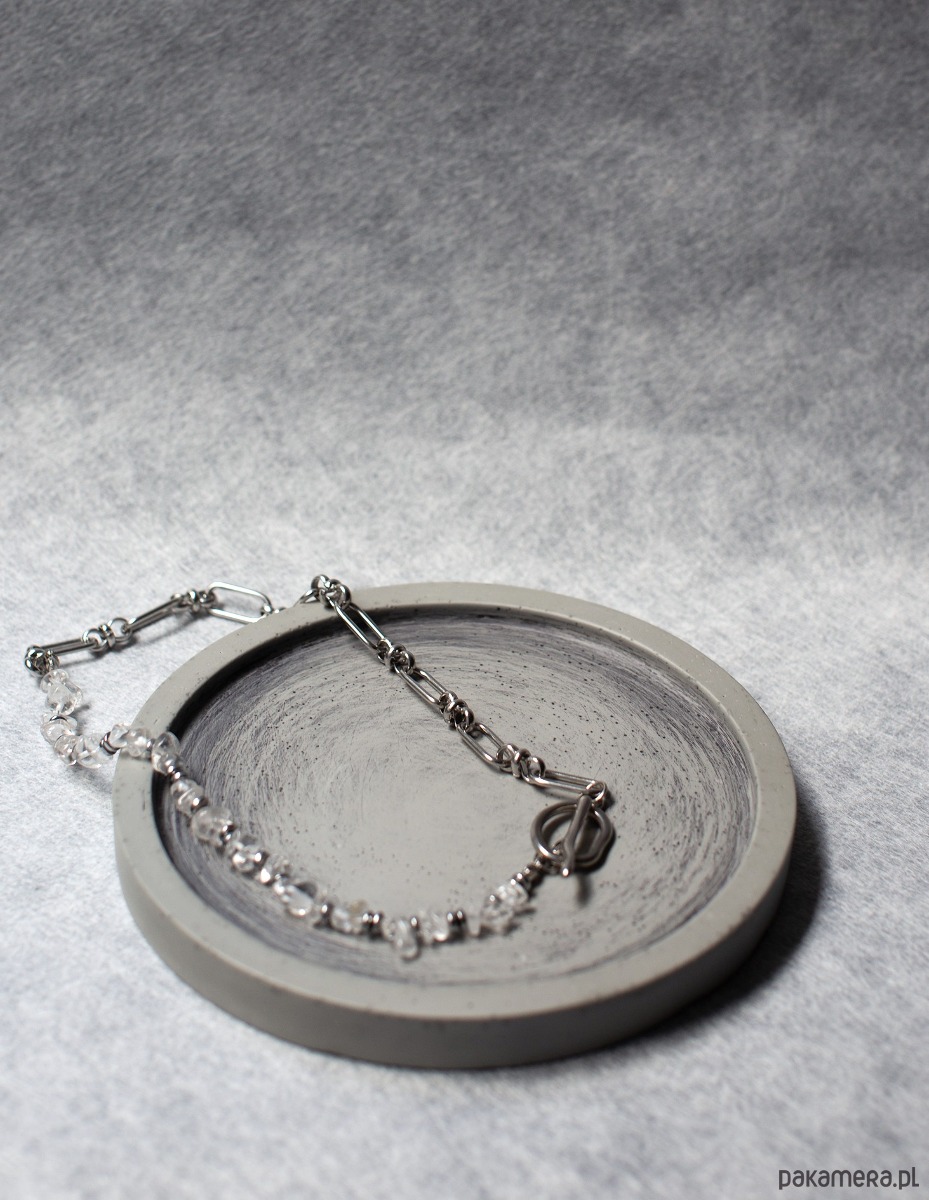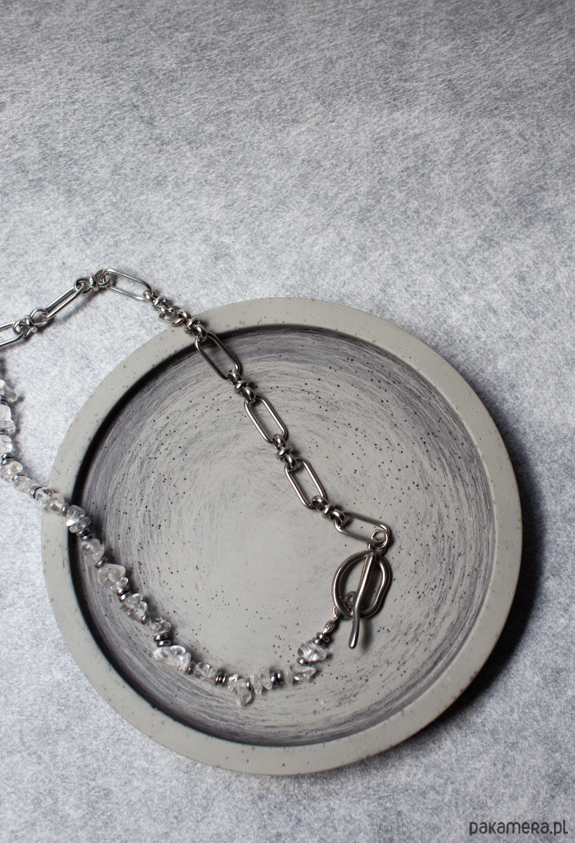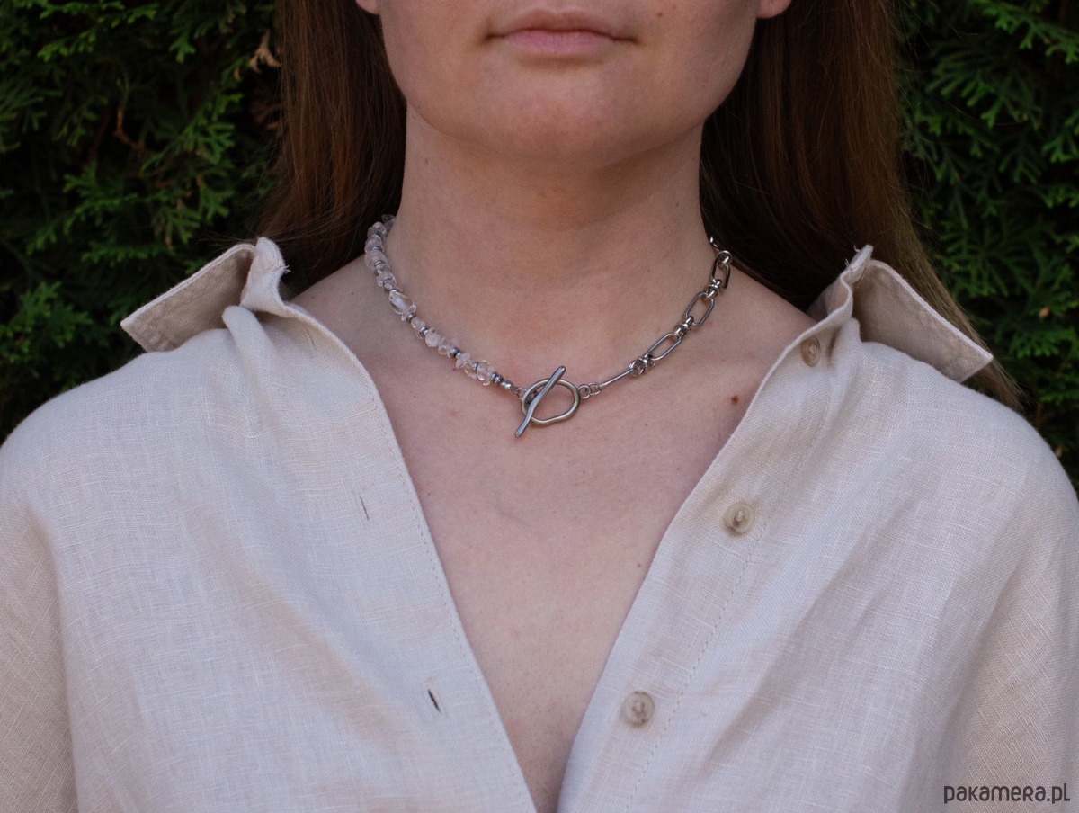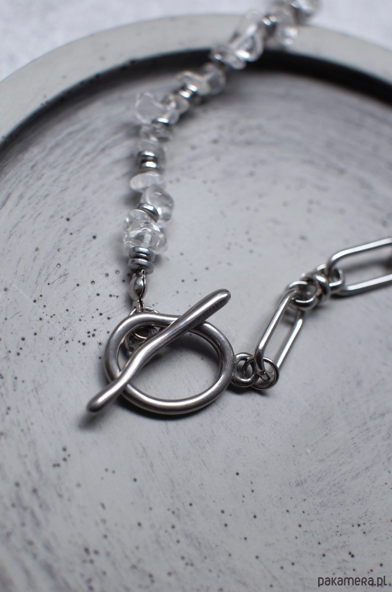 Elegancki naszyjnik wykonany z wytrzymałej stali szlachetnej, ozdobiony wstawkami z kryształem górskim i hematytem. Połączenie masywnych ogniw i cienkich łańcuszków nadaje biżuterii nowoczesnego, stylowego charakteru.
