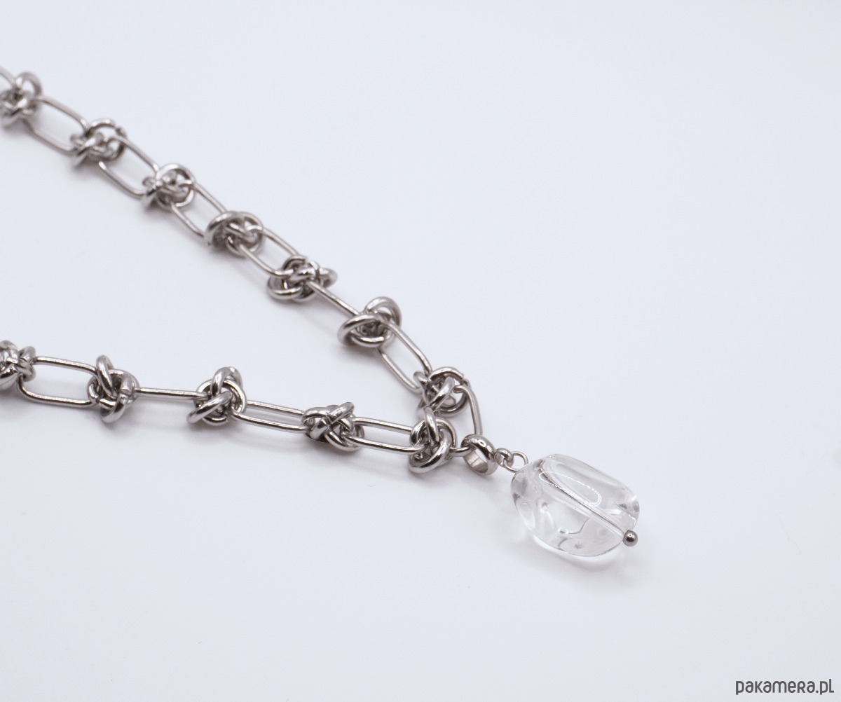 Stylowy naszyjnik wykonany z łańcucha ze stali nierdzewnej o wyrazistym, rytmicznym splocie. Centralnym akcentem biżuterii jest zawieszka z naturalnego kryształu górskiego — przezroczystego kamienia z naturalnymi inkluzjami i organiczną formą.