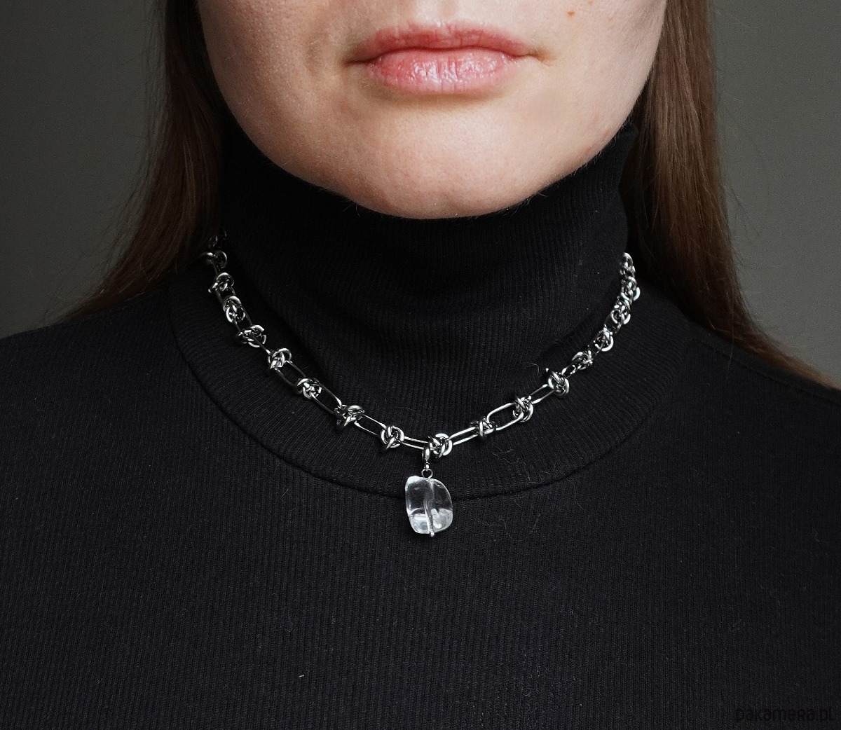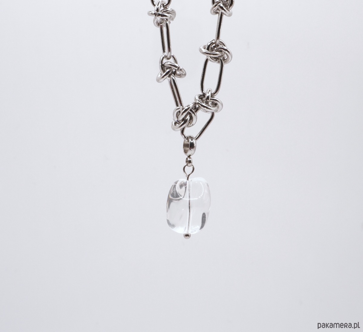Stylowy naszyjnik wykonany z łańcucha ze stali nierdzewnej o wyrazistym, rytmicznym splocie. Centralnym akcentem biżuterii jest zawieszka z naturalnego kryształu górskiego — przezroczystego kamienia z naturalnymi inkluzjami i organiczną formą.