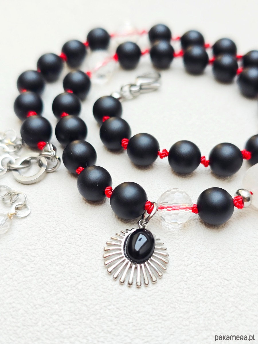 Wykonany z kamieni czarnego, matowego onyksu i kryształu górskiego.