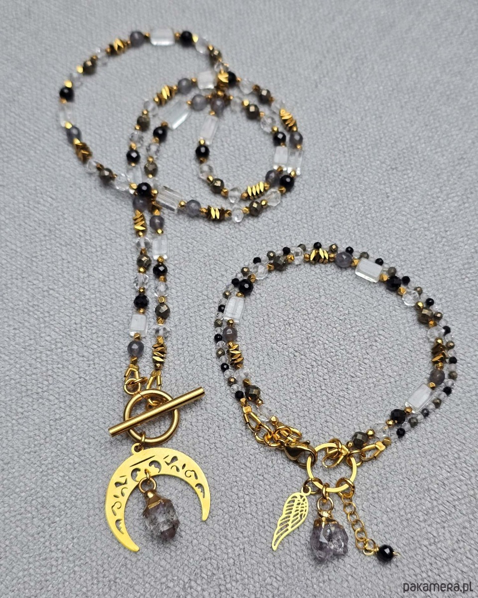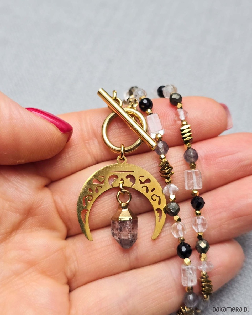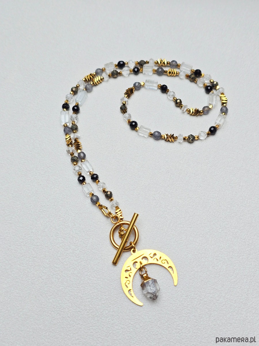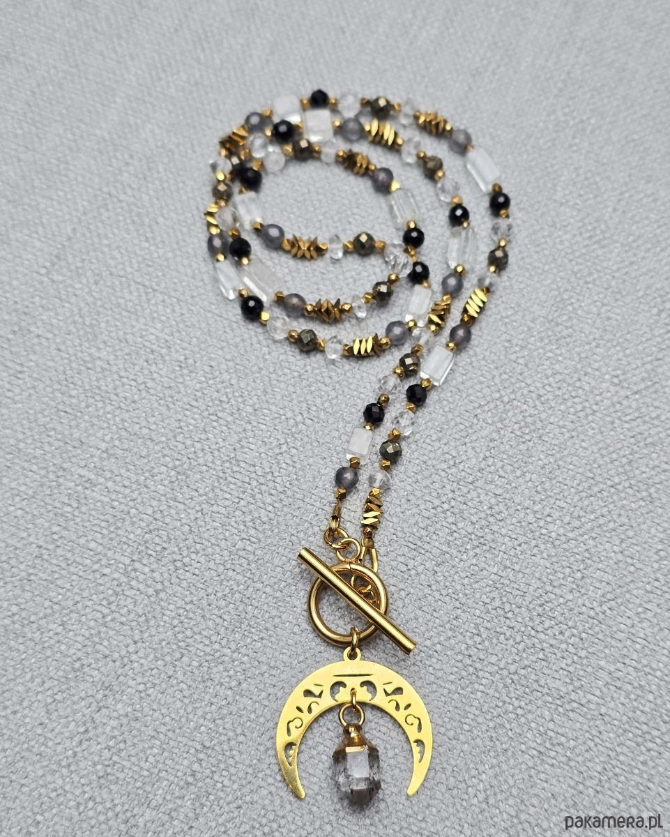 Naszyjnik wykonany z kamieni naturalnych tj.: kryształ górski, czarny spinel, piryt, szary agat, złocony hematyt. Zdobi go lunula z zawieszonym w jej środku kryształem.
