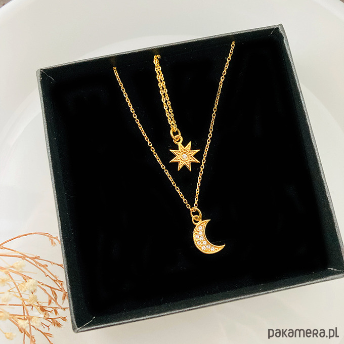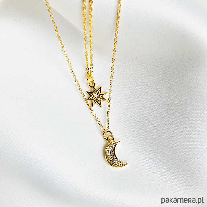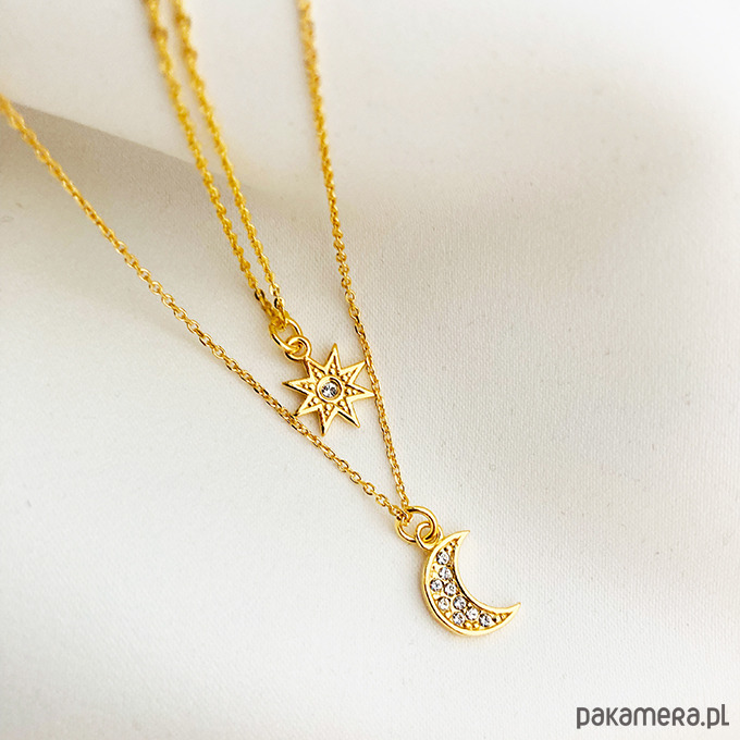 Efektowny wyjątkowy komplet naszyjników z księżycem i gwiazdką. Wykonany ze srebra próby 925 złocony 24 k złotem.Możliwy zakup naszyjników pojedynczo.