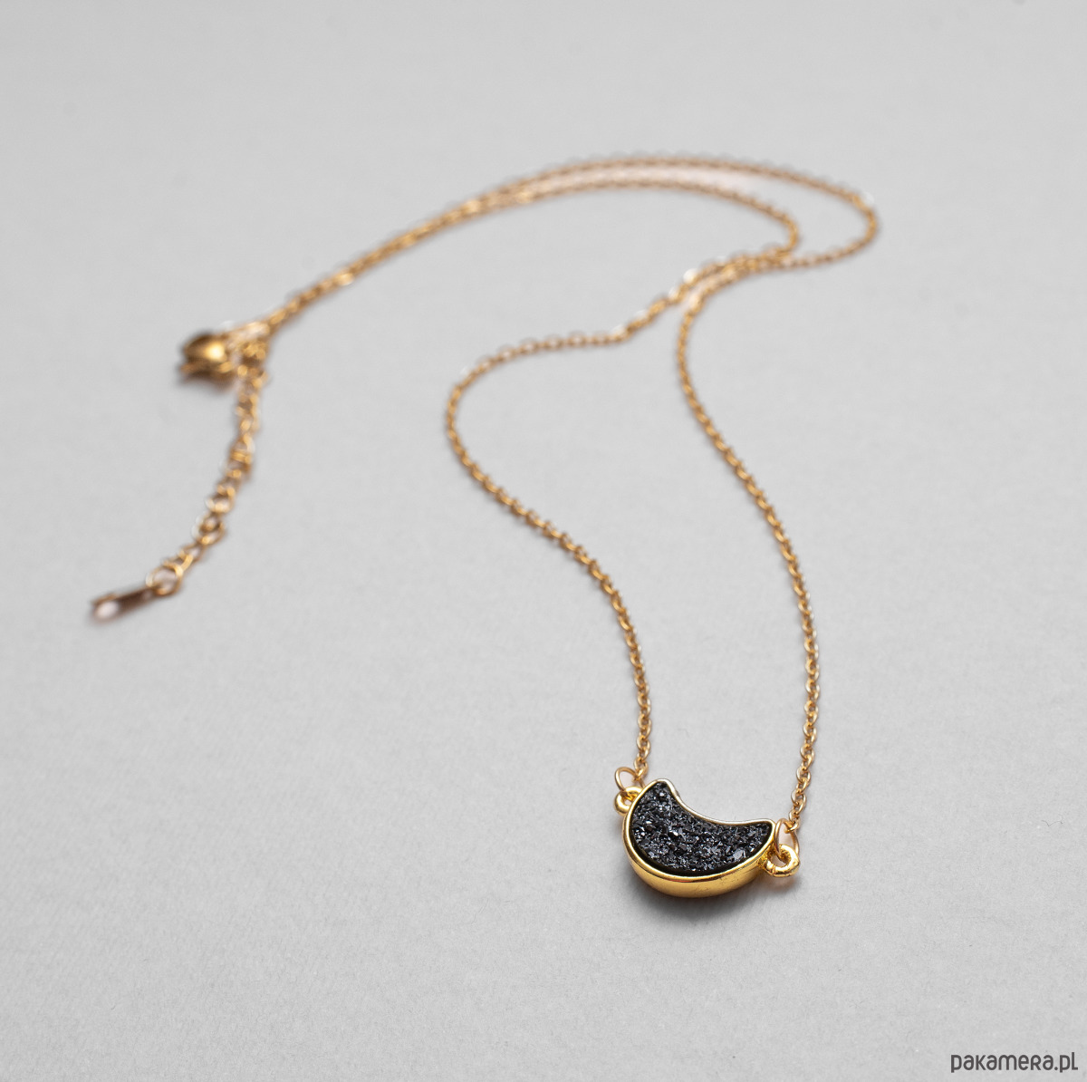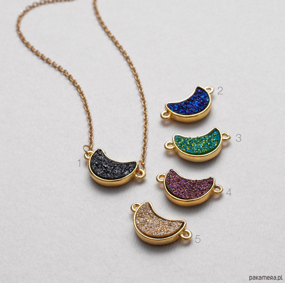 Wybierasz trwałość i efektowny design. Zawieszka w kształcie księżyca wykonana jest z wysokiej jakości żywicy, która imituje naturalny, brokatowy blask druzy. Łańcuszek to hipoalergiczna stal szlachetna, pokryta trwałym złoceniem, co zapewnia komfort i odporność na czernienie.