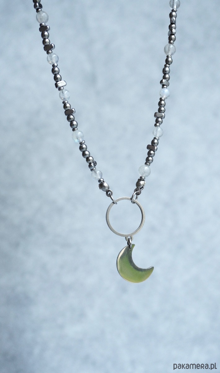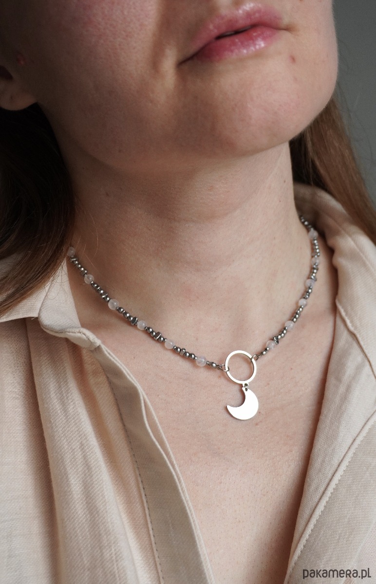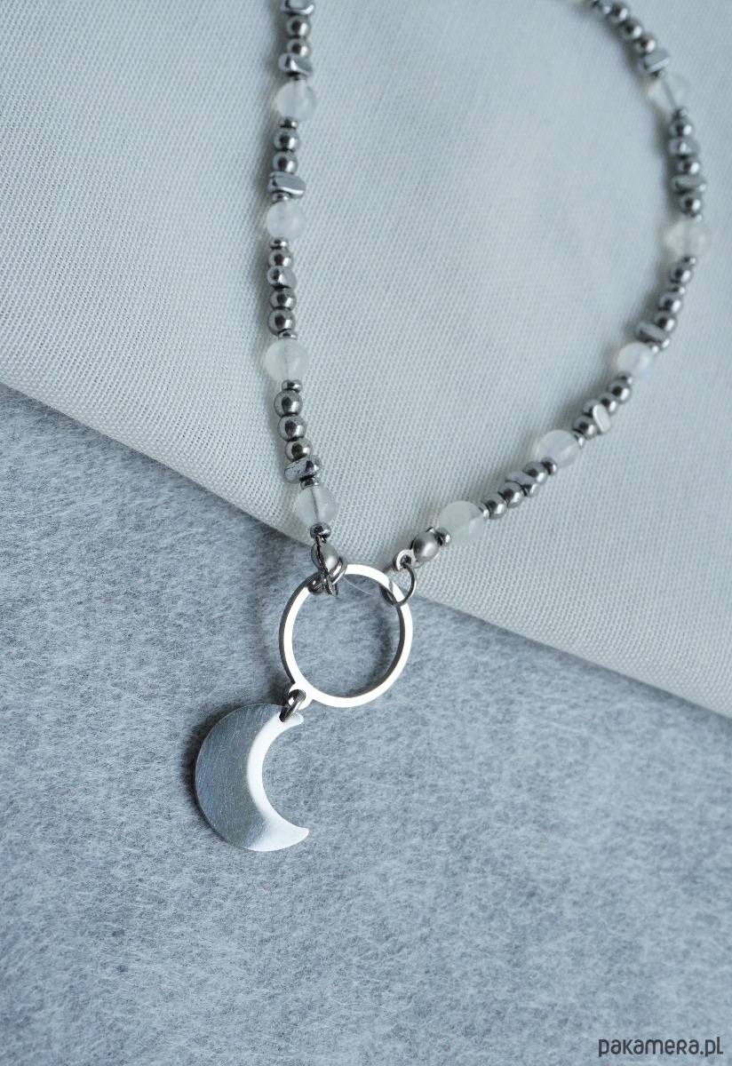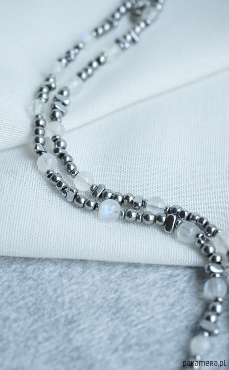 To subtelny naszyjnik, który łączy w sobie delikatną magię kamienia księżycowego i siłę hematytu. Miękki blask półprzezroczystych koralików kamienia księżycowego harmonijnie współgra z metalicznym połyskiem hematytu, tworząc równowagę między kobiecością a wewnętrzną stabilnością.