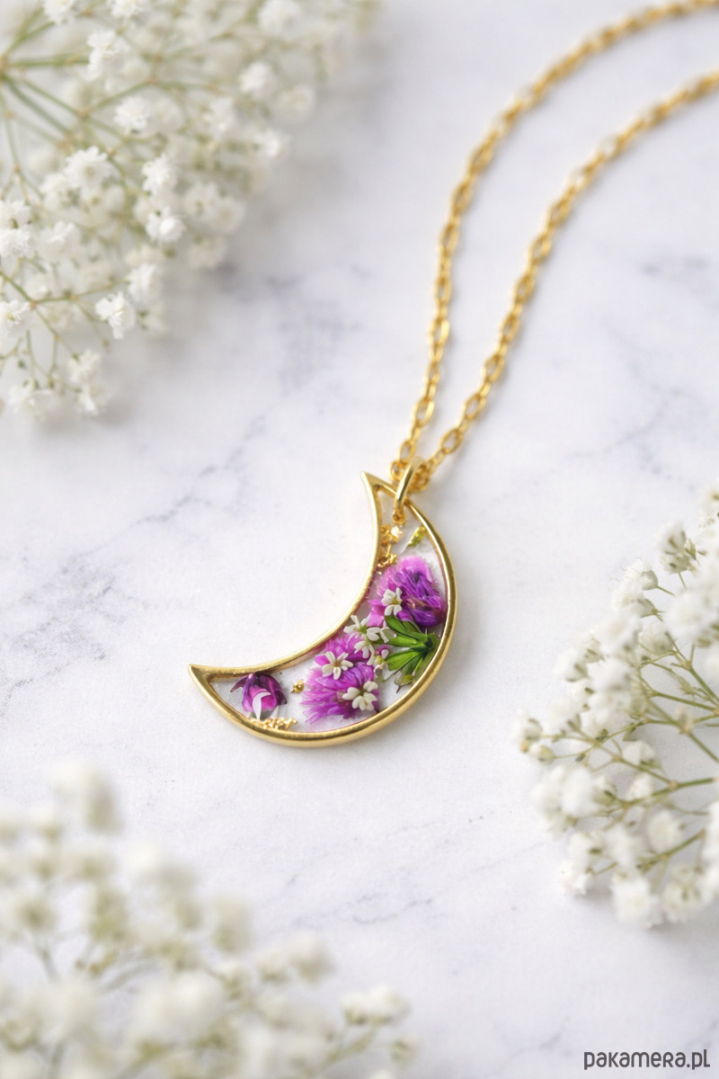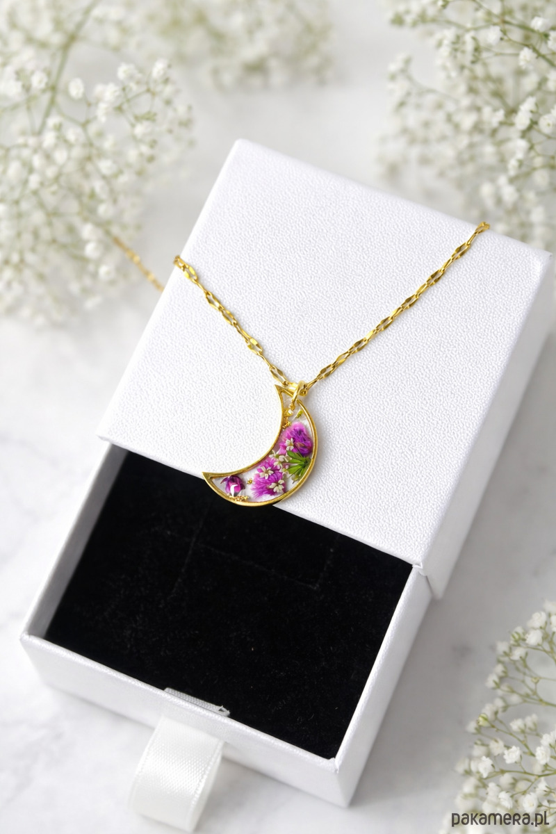 Naszyjnik w kształcie delikatnego półksiężyca to subtelne połączenie natury i elegancji. Złota oprawa otula kompozycję prawdziwych, ręcznie zatopionych w żywicy kwiatów – drobnych gipsówek i misternych baldachimów dzikiej marchwi. Każdy detal został ułożony z precyzją, tak aby zachować lekkość i przestrzenność roślin.